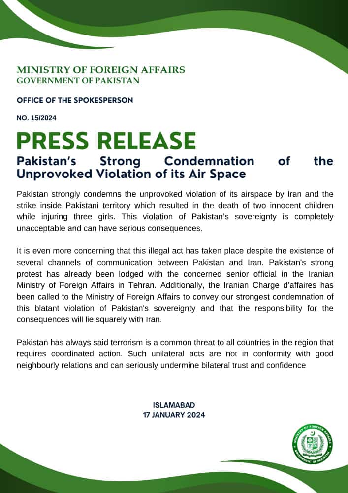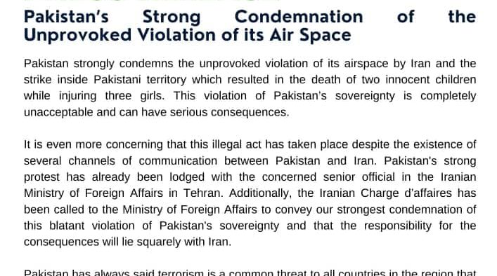 Pakistan strongly condemns the unprovoked violation of its airspace by Iran which resulted in death of two innocent children while injuring three girls. This violation of Pakistan’s sovereignty is completely unacceptable and can have serious consequences.