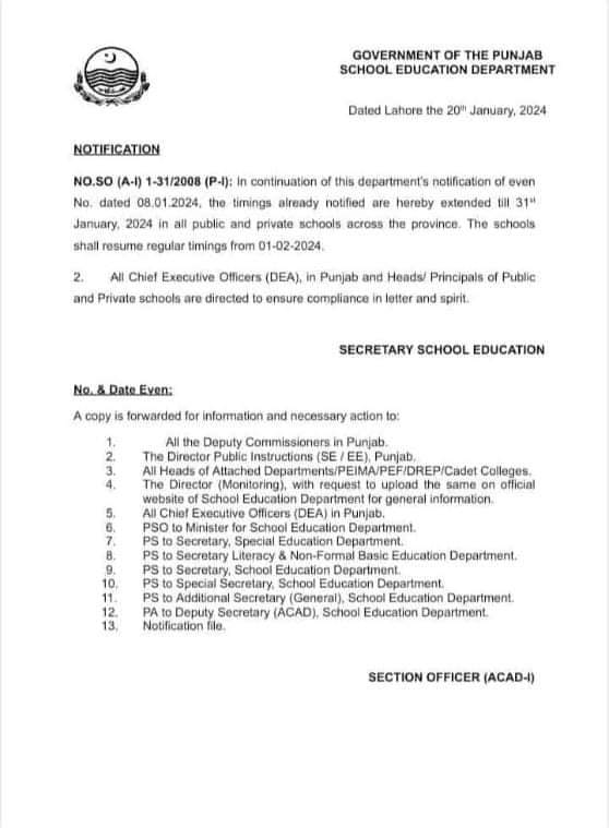 31 جنوری 2024ء تک پنجاب کے اسکولوں کے کھلنے کے اوقات کار صبح ساڑھے 9 بجے ہونگے، نوٹیفیکیشن