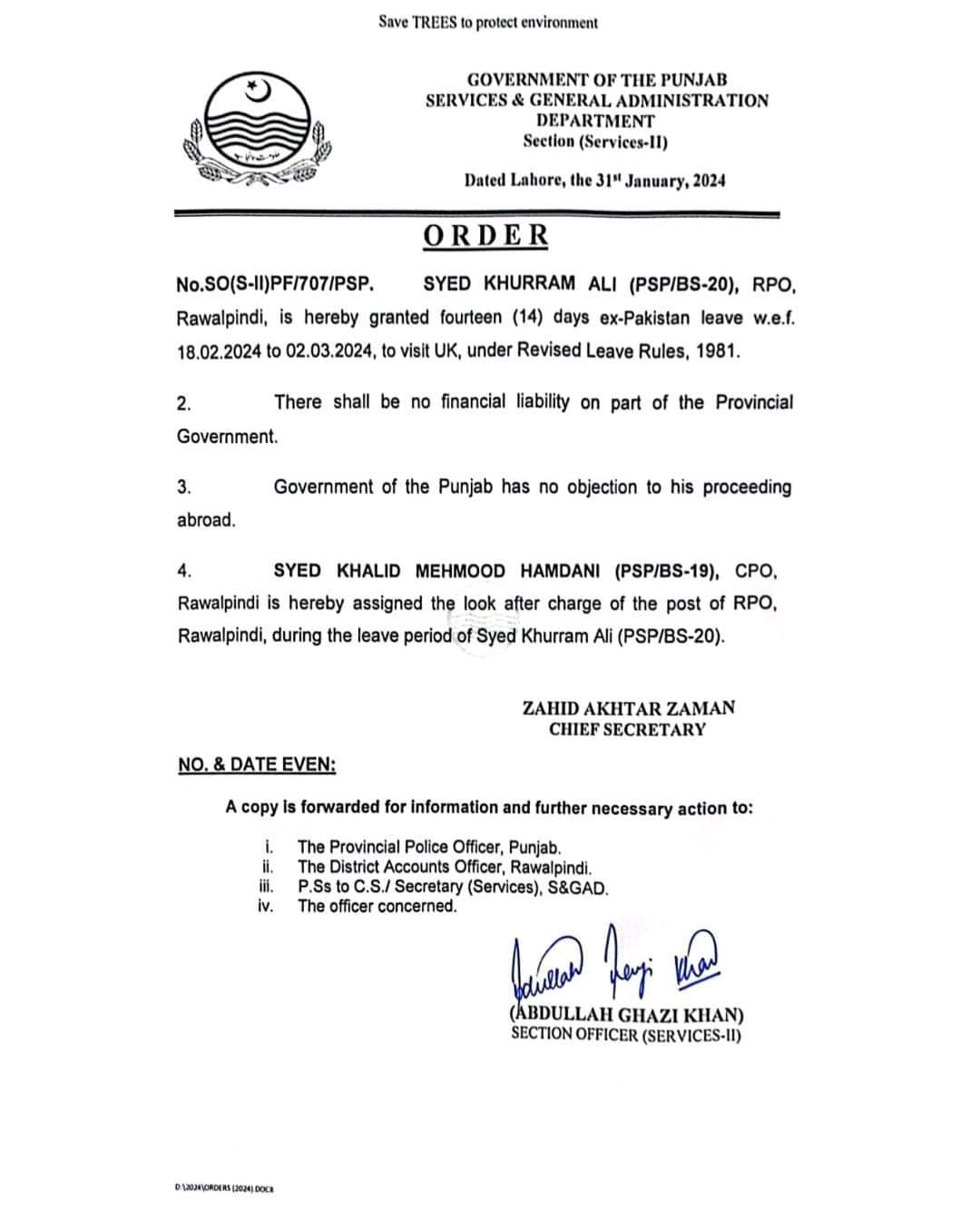 آر پی او راولپنڈی سید خرم علی کی 18 فروری تا 02 مارچ بیرون ملک رخصت کا نوٹیفکیشن جاری کیا گیا۔