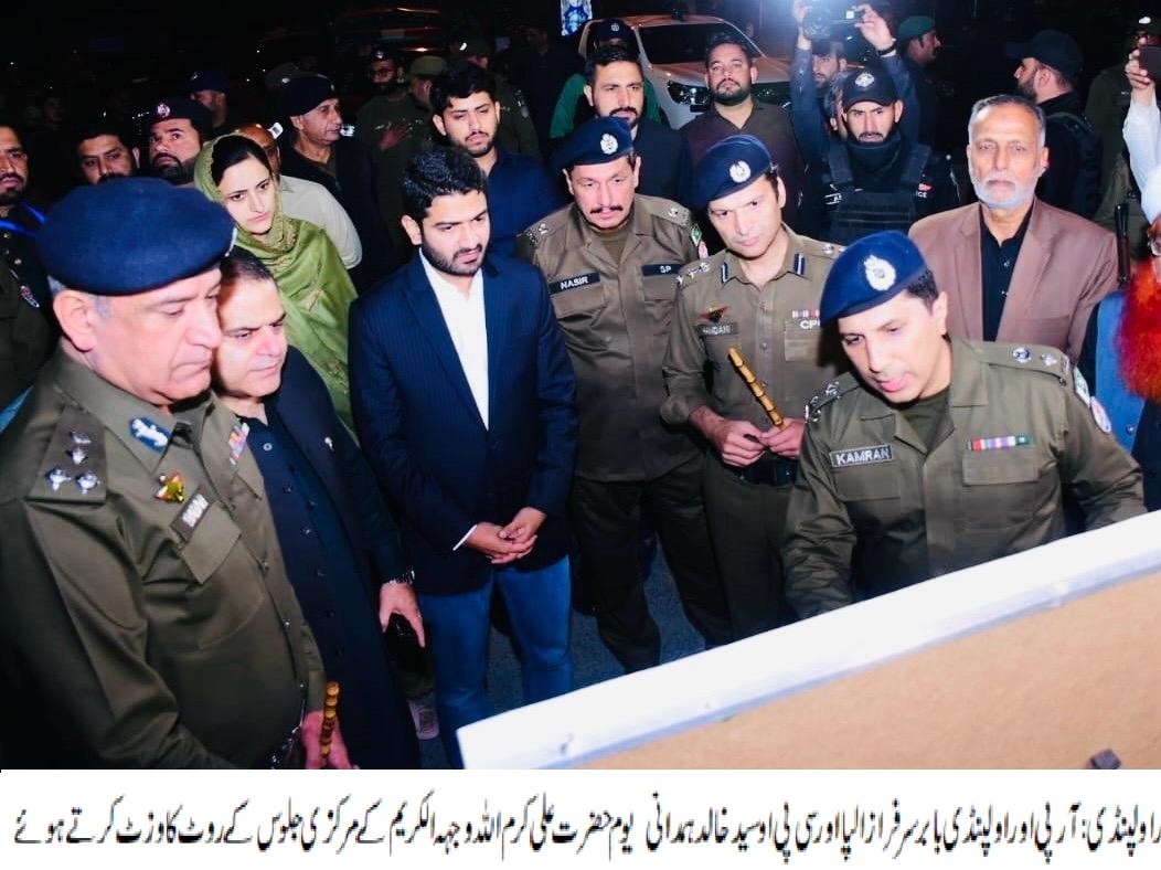 آر پی او راولپنڈی بابر سر فراز الپا اور سی پی او سید خالد ہمدانی نے گزشتہ رات یوم حضرت علی کرم اللہ وجہہ الکریم کے مرکزی جلوس کے روٹ کا وزٹ کیا،آر پی او راولپنڈی اور سی پی او راولپنڈی نے مرکزی جلوس کے سیکورٹی انتظامات کا جائزہ لیا اورافسران کو ہدایات دیں،اس موقعہ پر کمشنر راولپنڈی انجینئر عامر خٹک، ڈپٹی کمشنر راولپنڈی حسن وقارچیمہ، ایس ایس پی آپریشنز، ایس پی پوٹھوہار سمیت دیگر افسران بھی ہمراہ تھے،مرکزی جلوس پر راولپنڈی پولیس کے 1100افسران ڈیوٹی کے فرائض سرانجام دے رہے ہیں،مرکزی جلوس پر 80سے زائد ٹریفک افسران و اہلکار ٹریفک ڈیوٹی کے فرائض سرانجام دے رہے ہیں،ضلع بھر میں جلوسوں و مجالس پر2200سے زائد سیکورٹی و ٹریفک اہلکار فرائض سرانجام دے رہے ہیں،سی پی اوسید خالد ہمدانی نے کہاکہ جلوس میں داخلے کے وقت باڈی سرچ اور واک تھرو گیٹس سے چیکنگ کی جارہی ہے، روف ٹاپ پر ماہر نشانہ باز تعینات کئے گئے ہیں،سینئر پولیس افسران لمحہ بالمحہ ڈیوٹی کو چیک اور بریف کر رہے ہیں،جلوس کے فول پروف سکیورٹی انتظامات کو یقینی بنایا جارہا ہے،آر پی او بابر سر فراز الپا کا کہناتھاکہ شہریوں کی جان و مال کی حفاظت اولین ترجیح ہے، جلوس کی موثر سیکورٹی کے لئے تمام اقدامات اٹھائے جا رہے ہیں۔