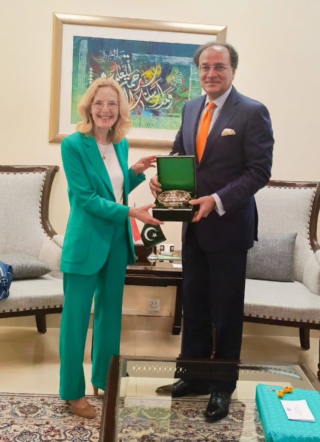 H.E. Mrs. Henny de Vries, Ambassador of the Kingdom of the Netherlands to Pakistan, called on Mr. Muhammad Aurangzeb, Minister for Finance and Revenue, to discuss matters of mutual interest and strengthen the existing ties between Pakistan and the Netherlands.