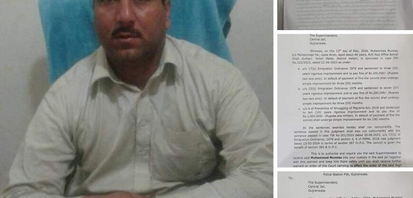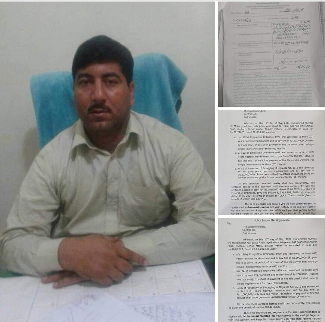 مجموعی طور پر 60 سال قید جبکہ 42 لاکھ روپے جرمانہ کی سزادینے کا حکم سنایاہے مجرم کو سزا خصوصی عدالت کے جج محمد نعیم شیخ نے سنائی مجرم کو سزائیں امیگریشن آرڈیننس 1979 کے تحت سزاہوئی ہے مجرم کے خلاف تھانہ ایف آئی اے گوجرانوالہ میں انسانی اسمگلنگ کے 3 مختلف مقدمات درج تھے.