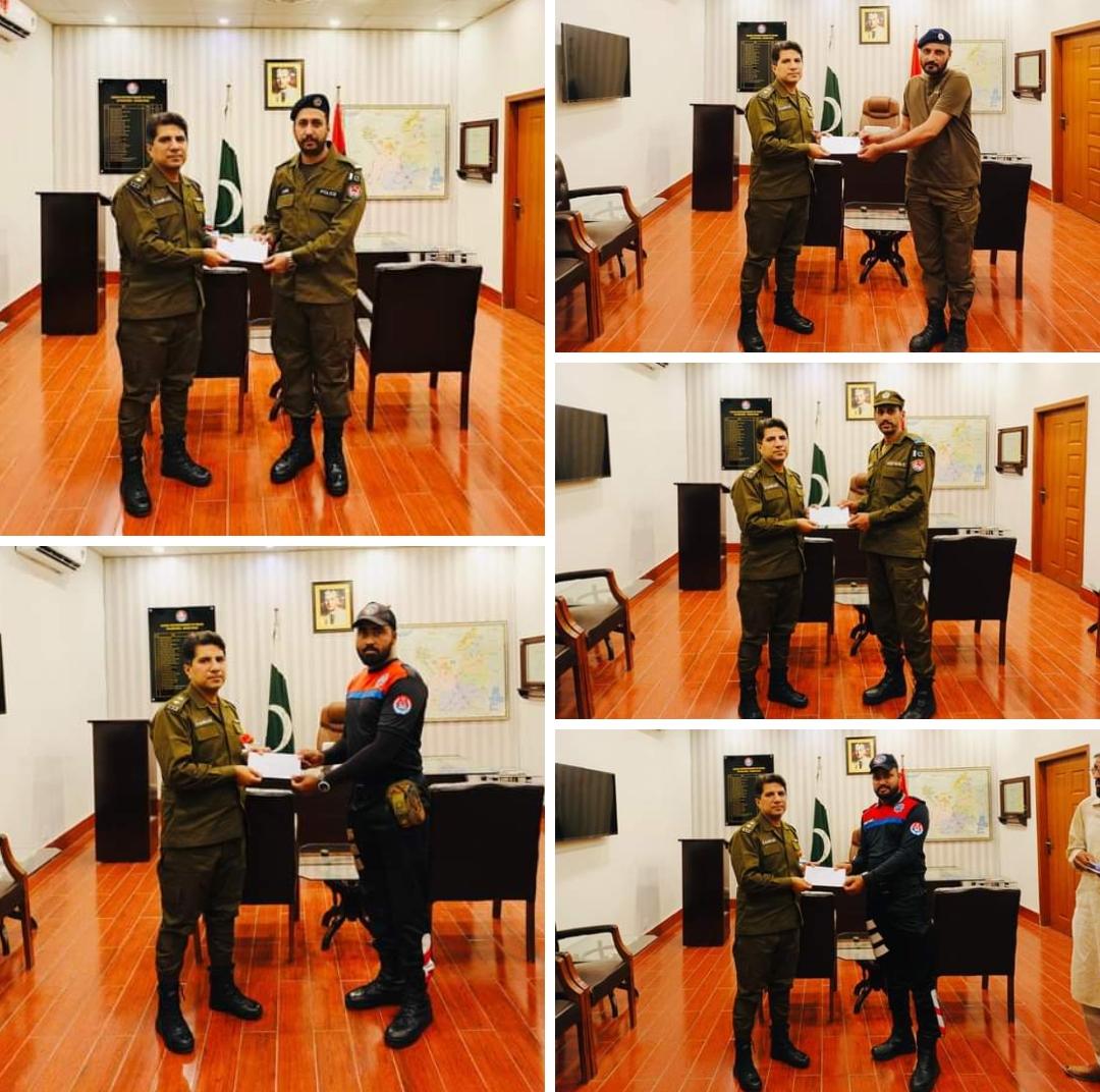 ایس ایس پی آپریشنز فلائٹ لیفٹیننٹ (ر) حافظ کامران اصغر نے ڈاکوؤں، منشیات فروشوں، شرپسند عناصر سے مقابلوں میں زخمی ہونے والے پولیس غازیوں میں 12 لاکھ روپے کے چیکس تقسیم کیے،