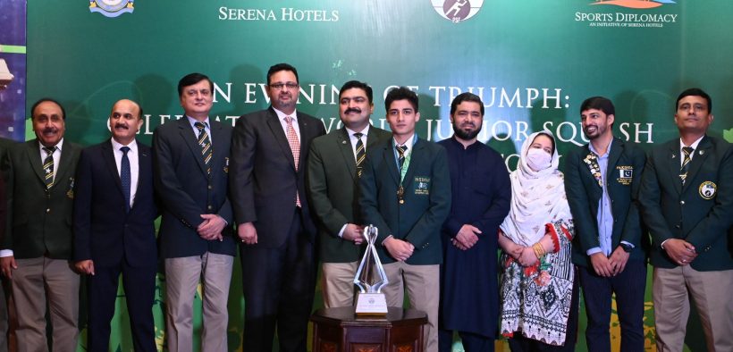 Islamabad : Serena Hotels and the Pakistan Squash Federation celebrate Hamza Khan’s historic win at the 2023 World Junior Squash Championship