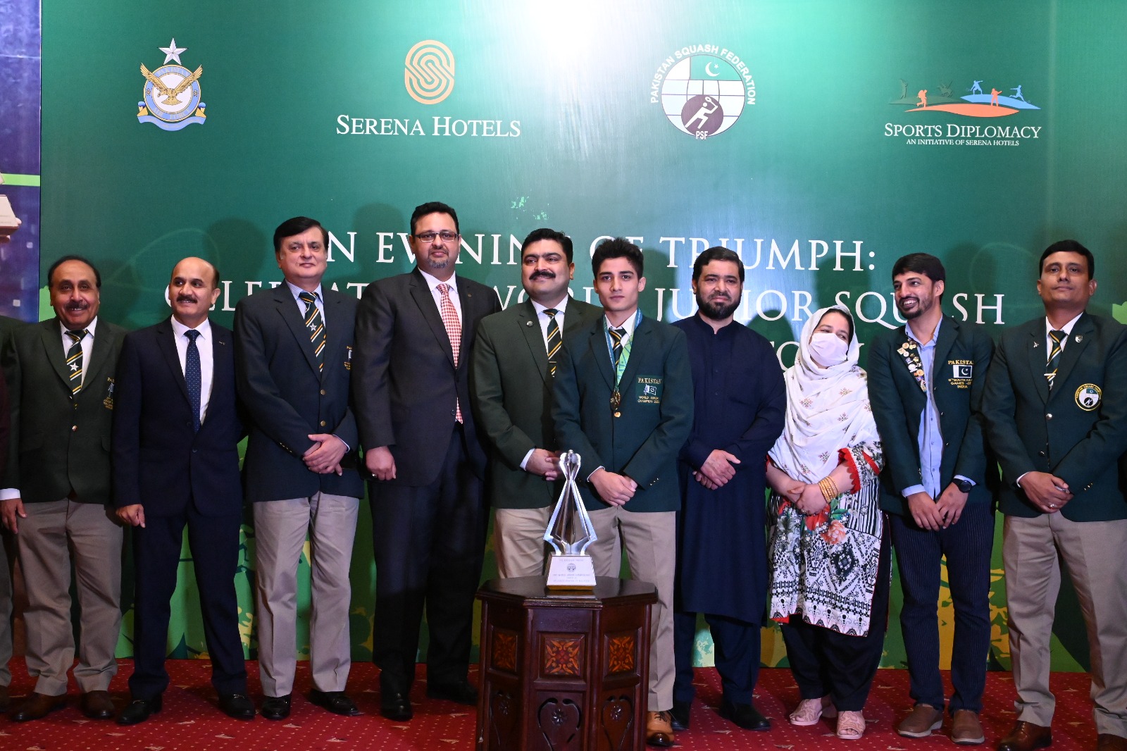 In a ceremony hosted by Serena Hotels under its sports diplomacy initiative partnering with the Pakistan Squash Federation, Senior Vice President, Air Vice Marshal, Mr. Kazim Hammad, was the chief guest on the auspicious occasion, and he presented Hamza Khan with the Trophy along with his family making it even more special for the young athlete.