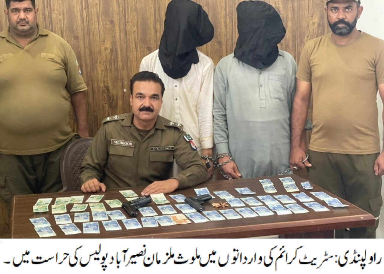 راولپنڈی( )ایس ایچ او نصیر آباد محمد ابراھیم کی ہمراہ پولیس ٹیم کاروائی، سٹریٹ کرائم کی وارداتوں میں ملوث گینگ کے 02 ملزمان گرفتار، مسروقہ رقم 50 ہزار روپے اور وارداتوں میں استعمال ہونے والا اسلحہ برآمد۔ تفصیلات کے مطابق نصیر آباد پولیس نے کاروائی کرتے ہوئے سٹریٹ کرائم کی وارداتوں میں ملوث گینگ کے 02 ملزمان کو گرفتار کر لیا،ملزمان کی شناخت گلفام اور عادل کے نام سے ہوئی، ملزمان سے مسروقہ رقم 50 ہزار روپے اور وارداتوں میں استعمال ہونے والا اسلحہ برآمد ہوا، ملزمان سے مزید مال مسروقہ کی برآمدگی کا تحرک شناخت پریڈ کے بعد کیا جائے گا،ایس پی پوٹھوہار ناصر نواز کا کہنا تھا کہ گرفتار ملزمان کو ٹھوس شواہد کے ساتھ چالان کر کے قرار واقعی سزا دلوائی جائے گی،شہریوں کو انکے قیمتی اثاثے سے محروم کرنے والے ملزمان قانون کی گرفت سے نہیں بچ سکتے۔