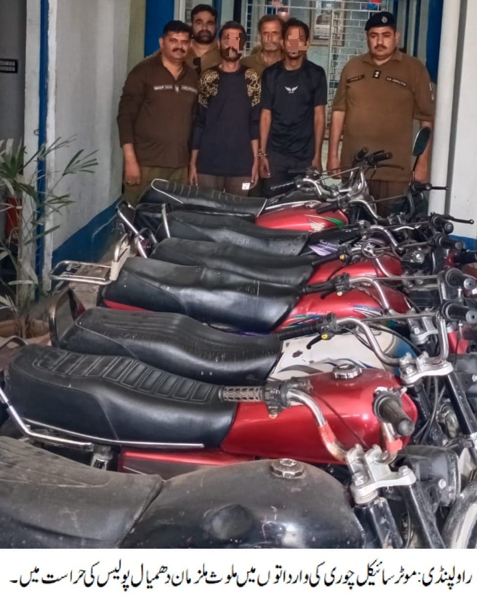 راولپنڈی(ڈیجیٹل پوسٹ) دھمیال پولیس کی کاروائی،موٹرسائیکل چوری کی وارداتوں میں ملوث 02 ملزمان گرفتار