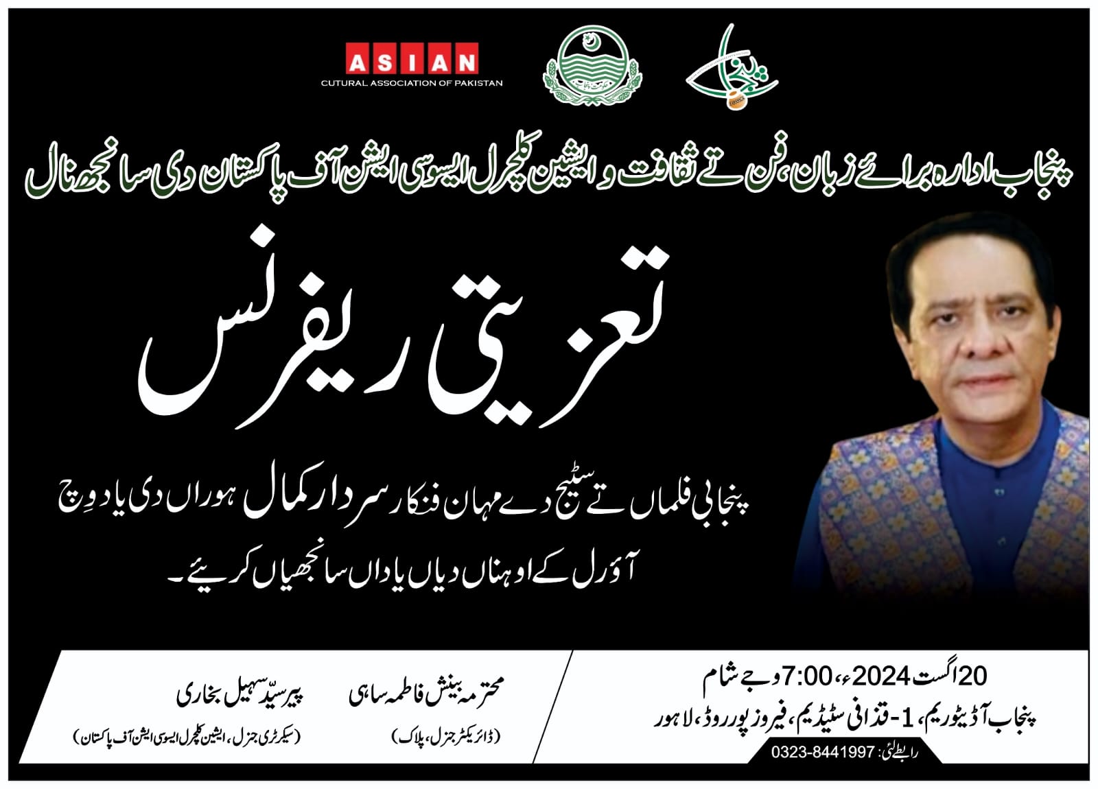 پنجاب ادارہ برائے زبان ، فن وثقافت اور ایشین کلچرل ایسوسی ایشن آف پاکستان کے اشتراک سے پنجابی فلم ، ٹی وی ، سٹیج کے عظیم فنکار سردار کمال کی فنی خدمات کو خراج عقیدت پیش کرنے کیلئے ایک تعزیتی ریفرنس پنجاب آڈیٹوریم پلاک قذافی سٹیڈیم میں منعقد کیا گیا – جس میں فلم ،ٹی وی ، سٹیج کے نامور فنکاروں ، تخلیق کاروں نے بھرپور شرکت کی – تقریب کا باقاعدہ آغاز قاری سعید اویسی کی تلاوت قرآن پاک سے کیا گیا – معروف نعت خواں غلام مصطفٰی قادری نے نعت رسول مقبول صلی اللہ علیہ وآلہ وسلم پیش کی – تعزیتی ریفرنس کی نظامت کے فرائض نامور شاعر اعظم منیر نے بڑے احسن طریقے سے انجام دیئے – ایشین کلچرل ایسوسی ایشن آف پاکستان کے بانی سیکرٹری جنرل و چیئرمین ایوارڈز کمیٹی پیر سید سہیل بخاری نے خطاب کرتے ہوئے کہا کہ ہم نے اپنی روایات کو برقرار رکھتے ہوئے لیجنڈ اداکار سردار کمال کو خراج عقیدت پیش کرنے کیلئے تعزیتی ریفرنس کا انعقاد کیا گیا ہے – ایشین کلچرل ایسوسی ایشن آف پاکستان کا قیام 1981ء میں ہوا – اس پلیٹ فارم کے تحت ایشین ایوارڈز ، ایشین ایکسی لینس پرفارمنس ایوارڈز ، ایشین میڈیا اینڈ بزنس ایوارڈز جوکہ پاکستان کی تاریخ میں پہلی مرتبہ الیکٹرانک اور پرنٹ میڈیا سے وابستہ افراد و شخصیات کو انکی اعلٰی کارکردگی پر 6 ،سالانہ تقریبات منعقد کی جا چکی ہیں – ایشین میڈیا اینڈ بزنس ایوارڈز کی تقریبات لاہور کے علاوہ اسلام آباد میں منعقد کی گئی – میری طبیعت کی ناسازی کی وجہ سے تقریبات تعطل کا شکار رہیں – اب انشاءاللہ 8 ،ربیع الاول کے بعد مختلف اضلاع میں تقریبات کا انعقاد کیا جائے گا – اسی طرح فلم ٹی وی ، سٹیج اور زندگی کے ہر شعبہ سے نمایاں افراد و شخصیات کو خراج تحسین پیش کرنے کیلئے ” اعتراف فن اور اعتراف خدمت ” کی تقریبات کا بانی ہوں اور دنیا سے چلے جانے والی شخصیات کی خدمات کو خراج عقیدت پیش کرنے کیلئے تعزیتی ریفرنس کا انعقاد کرنا بھی میرا اعزاز ہے – کچھ عرصہ میں ان تقریبات کو منعقد کرنے سے قاصر اس وجہ سے رہا کہ چند افراد نے میری تقلید کرتے ان ریفرنس کا انعقاد کیا مگر وہ یہ سلسلہ برقرار نہ رکھ سکے کیونکہ دنیا سے چلے جانے والوں سے انہیں کوئی مفاد حاصل نہ ہوا اور انہوں نے یہ سلسلہ بند کر دیا – پھر دوست احباب کے اصرار پر یہ سلسلہ دوبارہ شروع کرنا پڑا – اس سلسلے میں کی یہ تیسری تقریب ہے – پیرسیدسہیل بخاری نے کہا کہ آج لیجنڈ اداکار سردار کمال کو خراج عقیدت پیش کرنے کیلئے فلم ، ٹی وی ، سٹیج کے فنکاروں اور تخلیق کاروں کا ایک خوبصورت گلدستہ میرے سامنے ہال میں بیٹھا ہے اس کے ساتھ ساتھ عوام کی محبت کا اندازہ اس بات سے لگا لیں کہ آڈیٹوریم پلاک میں ہر مکتبہ فکر کے لوگوں کی موجودگی اس بات کی عکاسی کرتی ہے کہ سردار کمال کتنے مقبول تھے – پیر سید سہیل بخاری نے کہا کہ میں نے کبھی فنکار اور تخلیق کار کو مرحوم نہیں لکھا کیونکہ فنکار کا فن نہیں مرتا اور تخلیق کار کی تخلیق زندہ رہتی ہے –