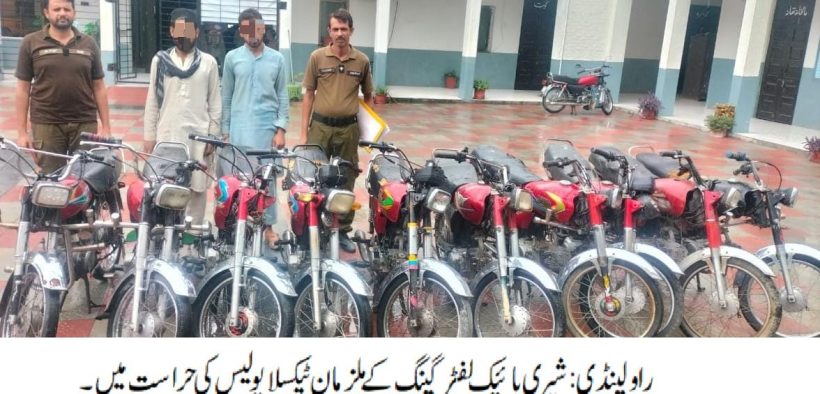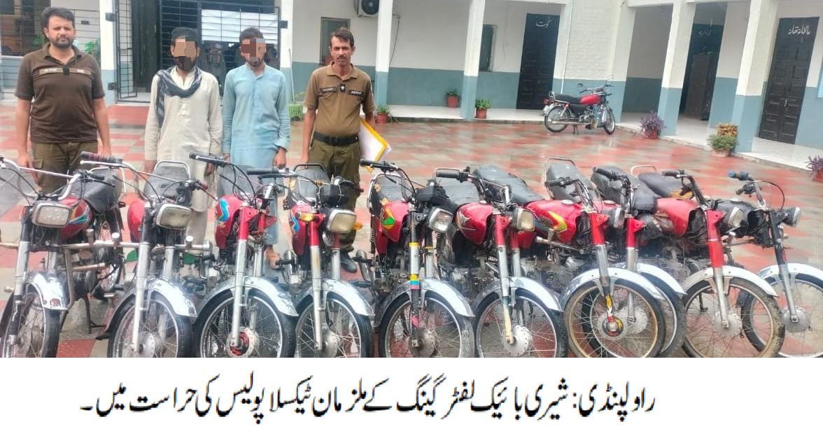 راولپنڈی( ) ایس ایچ او ٹیکسلا راجہ گلتاج کی ہمراہ پولیس ٹیم کاروائی، شیری بائیک لفٹر گینگ گرفتار، 10 مسروقہ موٹر سائیکل برآمد۔ تفصیلات کے مطابق ٹیکسلا پولیس نے کاروائی کرتے ہوئے شیری بائیک لفٹر گینگ کو گرفتار کرلیا،گرفتار ملزمان میں گینگ کا سرغنہ شیراز عرف شیری اور یوسف شامل ہیں،ملزمان سے 10 مسروقہ موٹر سائیکل برآمدہوئے، دو رکنی گینگ موٹر سائیکل چوری کی متعدد وارداتوں میں مطلوب تھا،ایس پی پوٹھوہار نے ایس ڈی پی او ٹیکسلا اور ٹیم کو شاباش دیتے ہوئے کہا کہ شہریوں کو ان کے قیمتی اثاثے سے محروم کرنے والے ملزمان کے خلاف کاروائیاں جاری رکھی جائیں گی۔