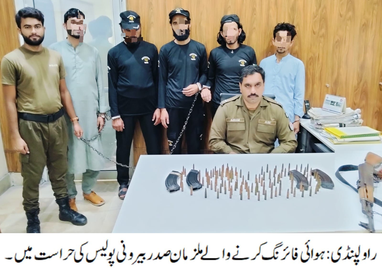 راولپنڈی ( ) ایس ایچ او ندیم ظفر کی زیرنگرانی صدر بیرونی پولیس کی کاروائی، ہوائی فائرنگ کرنے والے 05 ملزمان گرفتار،ملزمان سے کلاشنکوف، میگزینز اور گولیاں برآمد ہوئیں۔ تفصیلات کے مطابق صدر بیرونی پولیس نے کاروائی کرتے ہوئے ہوائی فائرنگ کرنے والے 05 ملزمان کو گرفتارکر لیا،گرفتار ملزمان میں عاشق، آصف، نور ولی، نادر اور نیاز شامل ہیں، ملزمان سے کلاشنکوف، میگزینز اور گولیاں برآمد ہوئیں،ملزمان کے دیگر ساتھیوں کی گرفتاری کا تحرک جاری ہے، ایس پی صدر محمد نبیل کھوکھرکا کہنا تھا کہ ہوائی فائرنگ سے شہریوں کی زندگی کو خطرے میں ڈالنے والے قانون کی گرفت سے نہیں بچ سکتے۔