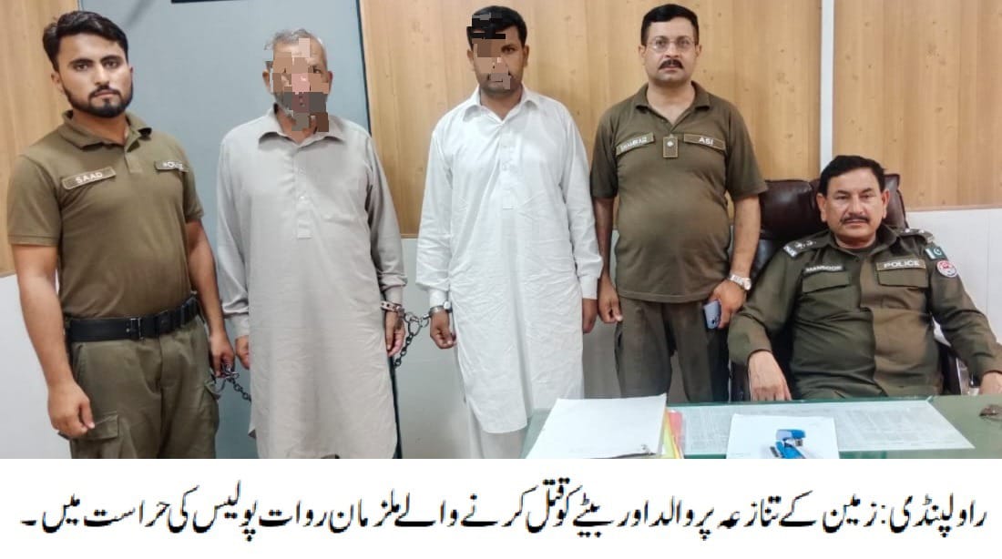 راولپنڈی( )تھانہ روات سب انسپکٹر منصور ستی کی ہمراہ پولیس ٹیم کاروائی، زمین کے تنازعہ پر والد اور بیٹے کو قتل کرنے والے 02 نامزد ملزمان گرفتار، ملزمان نے زمین کے تنازعہ پر فائرنگ کر کے احسن منیر اور اسکے والد محمد منیر کو قتل کر دیا تھا۔ تفصیلات کے مطابق روات پولیس نے کاروائی کرتے ہوئے زمین کے تنازعہ پر والد اور بیٹے کو قتل کرنے والے 02 نامزد ملزمان کو گرفتار کر لیا، گرفتار ملزمان میں کامران اور صغیر شامل ہیں،ملزمان نے زمین کے تنازعہ پر فائرنگ کر کے احسن منیر اور اسکے والد محمد منیر کو قتل کر دیا تھا، ملزمان کے 02 ساتھی عبداللہ اور شبیر قبل ازیں گرفتار ہو چکے ہیں،واقعہ کا مقدمہ رواں سال جولائی میں درج کیا گیا تھا، ایس پی صدر محمد نبیل کھوکھرکا کہنا تھا کہ شہریوں کی جان ومال کی حفاظت اور سہولیات کی فراہمی کو یقینی بنایا جا رہا ہے۔