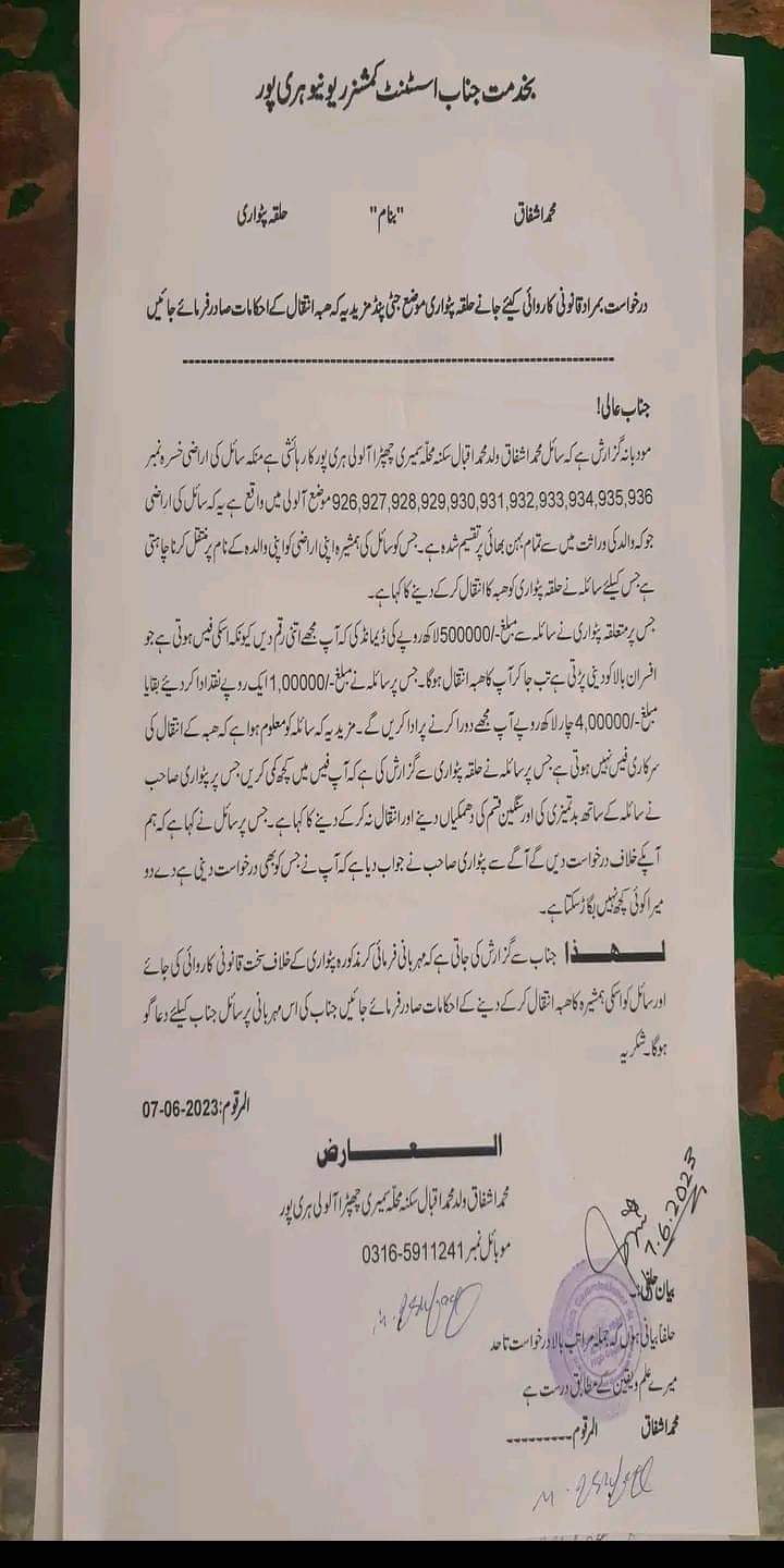 حلقہ پٹوار جٹی پنڈ میں تعنیات پٹواری نے ھبہ کے فری انتقال کےنام پرمبینہ طور پر ایک لاکھ روپے ہتھیالیے۔الولی کے رہائشی متاثرہ اشفاق نامی شخص نے ڈپٹی کمشنر ہری پور کو تحریری درخواست بھی دی ہے، جس کے باوجود بھی کوئی کاروائی نہ ہو سکی، متاثرہ شخص کی درخواست پر عمل درآمد نہ سکا،متاثرہ شخص نے جی ٹی روذ بلاک کرنے کی دھمکی دے دی،