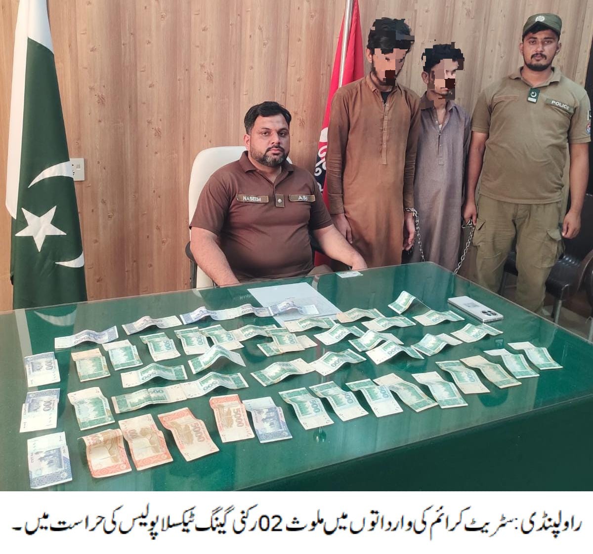 راولپنڈی( )ایس ایچ او تھانہ ٹیکسلا رانا کاشف کی زیرنگرانی پولیس ٹیم کی کاروائی، سٹریٹ کرائم کی وارداتوں میں ملوث 02 رکنی گینگ گرفتار،چھینا گیا موٹر سائیکل، نقدی 45 ہزار اور موبائل فون برآمد۔تفصیلات کے مطابق ٹیکسلا پولیس نے کاروائی کرتے ہوئے سٹریٹ کرائم کی وارداتوں میں ملوث 02 رکنی گینگ کوگرفتار کرلیا،گرفتار ملزمان میں بہادر اور سراج شامل ہیں، ملزمان سے چھینا گیا موٹر سائیکل، نقدی 45 ہزار اور موبائل فون برآمد ہوا، ایس پی پوٹھوہار ناصر نواز نے ایس ایچ او ٹیکسلا اور ٹیم کو شاباش دیتے ہوئے کہا کہ منظم و متحرک گینگز کے خلاف کارروائیاں جاری رکھی جائیں گی۔