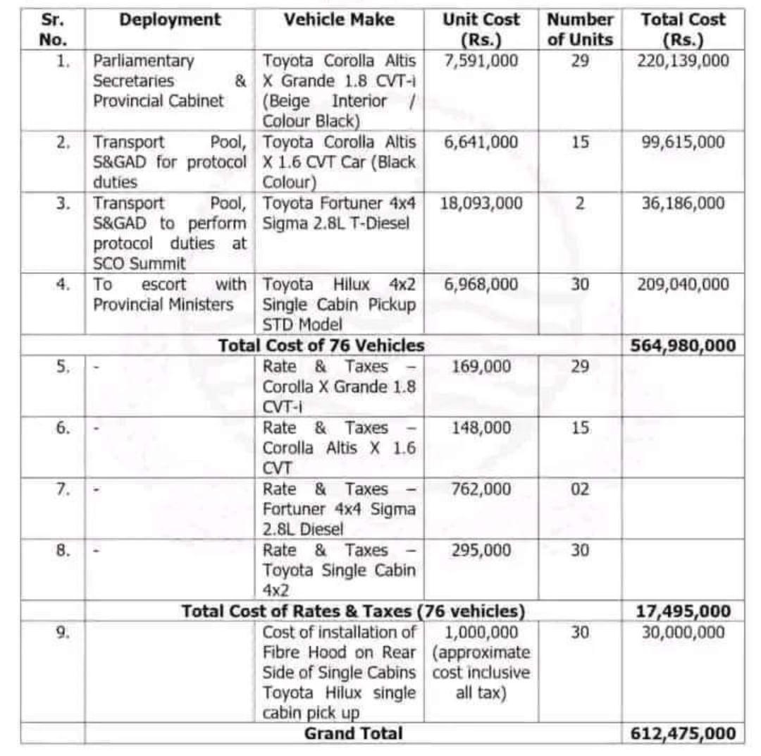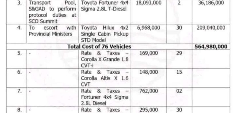 ان 30 ہائی لکس کیلئے سنگل کیبن اور فائبر ہُڈ کیلئے فی گاڑی 12 لاکھ 95 لاکھ اضافی رقم بھی جاری کی۔