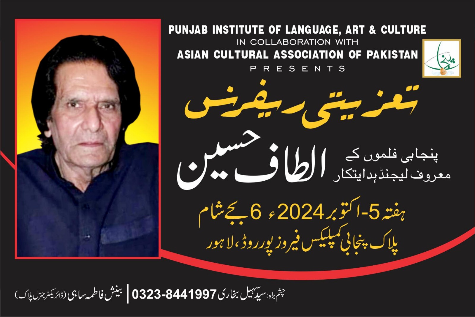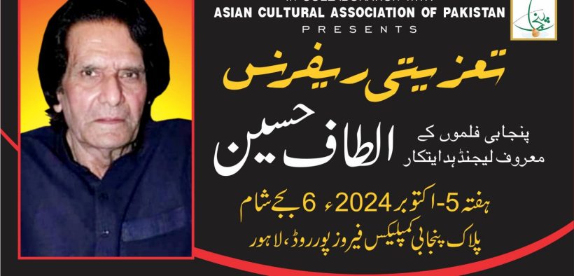 ایشین کلچرل ایسوسی ایشن آف پاکستان نے اپنی روایات کو برقرار رکھتے ہوئے پنجاب ادارہ برائے زبان فن و ثقافت کے اشتراک سے پنجابی فلموں کے لیجنڈ ہدایت کار الطاف حسین کی فنی اور تخلیقی خدمات کوخراج عقیدت پیش کرنے کیلئے ایک تعزیتی ریفرنس آج 5 – اکتوبر بروز ہفتہ شام 6 ، بجے پلاک قذافی سٹیڈیم فیروز پور روڈ لاہور میں منعقد ہو گا – اس بات کا اعلان ایشین کلچرل ایسوسی ایشن آف پاکستان کے سیکرٹری جنرل و چیئرمین ایوارڈز کمیٹی پیر سید سہیل بخاری نے کیا ہے – انہوں نے بتایا کہ تقریب میں اداکار ، تخلیق کار اور زندگی کے ہر شعبہ سے نمایاں افراد و شخصیات شریک ہو کر لیجنڈ ہدایت کار الطاف حسین کے فن اور شخصیت پر روشنی ڈالیں گے –