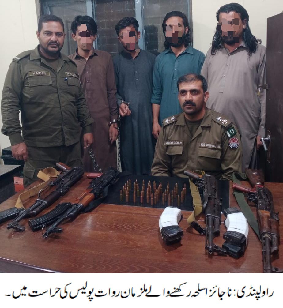 راولپنڈی ( )ایس ایچ او روات زاہد ظہور کی زیرنگرانی پولیس ٹیم کی کاروائی، ناجائز اسلحہ رکھنے والے 04 ملزمان گرفتار،ملزمان سے 04 کلا شنکوف، میگزینیں اور گولیاں برآمد ہوئیں۔تفصیلات کے مطابق روات پولیس عبدالمقدم سب انسپکٹر ۔ وسیم سرور اے ایس آئی نے ہمراہ ٹیم کاروائی کرتے ہوئے ناجائز اسلحہ رکھنے والے 04 ملزمان کو گرفتار کرلیا،گرفتار ملزمان کی شناخت بشیر، لقمان، عمیر اور سبز علی کے ناموں سے ہوئی،ملزمان سے 04 کلا شنکوف، میگزینیں اور گولیاں برآمد ہوئیں،ایس پی صدر محمد نبیل کھوکھر کا کہنا تھاکہ ناجائز اسلحہ رکھنے والوں کے خلاف بھرپور کاروائیاں جاری ہیں۔