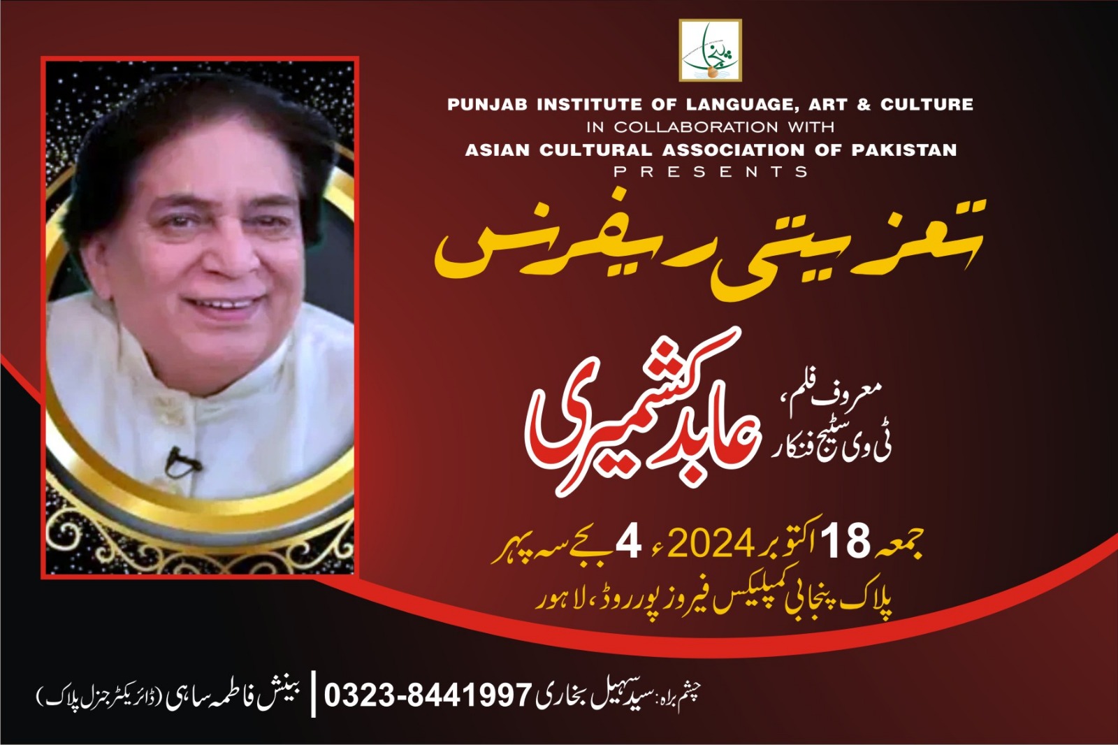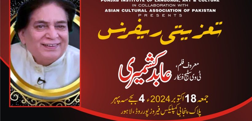ایشین کلچرل ایسوسی ایشن آف پاکستان نے اپنی روایات کو برقرار رکھتے ہوئے سٹیج ، ٹیلی ویژن اور فلم کے گلو بادشاہ ” عابد کشمیری ” کی فنی خدمات کو خراج عقیدت پیش کرنے کیلئے پنجاب ادارہ برائے زبان فن تے ثقافت ( پلاک ) کے اشتراک سے تعزیتی ریفرنس کا انعقاد پلاک آڈیٹوریم پنجابی کمپلیکس قذافی سٹیڈیم فیروز پور روڈ لاہور میں کیا گیا – تعزیتی ریفرنس کی میزبانی کے فرائض پیرسیدسہیل بخاری آرگنائزر وبانی ایشین کلچرل ایسوسی ایشن آف پاکستان نے کی – لیکن دوران تقریب طبیعت کی ناسازی اور سانس پھولنے کی وجہ سے مزید میزبانی کے فرائض محمد افتخار چاند نےبڑے احسن انداز میں سر انجام دیئے – ایشین کلچرل ایسوسی ایشن آف پاکستان کے سیکرٹری جنرل و بانی پیرسیدسہیل بخاری چئیرمین ایوارڈزکمیٹی نے اپنے ابتدائی خطاب میں کہا کہ میرا تعلق برصغیر کے ایک مذہبی اور روحانی گھرانے سے ہے میرا شجرہ نسب دسویں امام حضرت امام علی نقی علیہ السلام سے جا ملتا ہے – میرے آباواجداد نے بخارا سے ہجرت کی اور بغداد کو اپنا مسکن بنا لیا – پھر بغداد سے مکہ شریف تشریف لے گئے اور کئی سال بیت اللہ شریف کی خدمت میں گزارتے ہوئے اسلام کی تشہیر کیلئے برصغیر پاک وہند لاہور تشریف لے آئے – میرے اجداد کا نام حضرت سید عزیزالدین رحمتہ اللہ علیہ ہے جو حضرت پیر مکی رحمتہ اللہ علیہ کے نام سے مشہور و معروف ہیں – میرے والد 21 ،ویں صدی کے ولی اللہ تھے