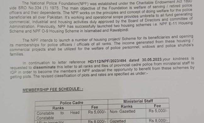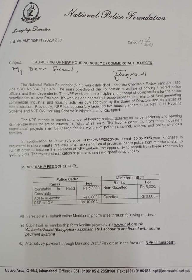 نیشنل پولیس فاؤنڈیشن کے زیر اہتمام پولیس ملازمین کیلئے نئی ہاؤسنگ سکیم لانچ کی جا رہی ہے۔ پنجاب پولیس کے ملازمین اس ہاؤسنگ سکیم سے فائدہ اٹھانے کیلئے نیشنل پولیس فاونڈیشن کی ویب سائٹ کے ذریعہ آن لائن ممبر شپ فارم فل کر کے اپلائی کرسکتے ہیں اور اسکی فیس موبائل بینکنگ، جاز کیش یا ایزی پیشہ کے ذریعہ یا پھر اپنے بنک کا ڈیمانڈ ڈرافٹ/ پے آرڈر “NPF Islamabad” کے نام بنوا کر ممبرشپ فارم کا پرنٹ اور ڈیمانڈ ڈرافٹ / پے آرڈر نیشنل پولیس فاونڈیشن کے دفتر اسلام آباد بھجوائیں۔ اس کی آخری تاریخ 31 اگست 2023 ہے۔