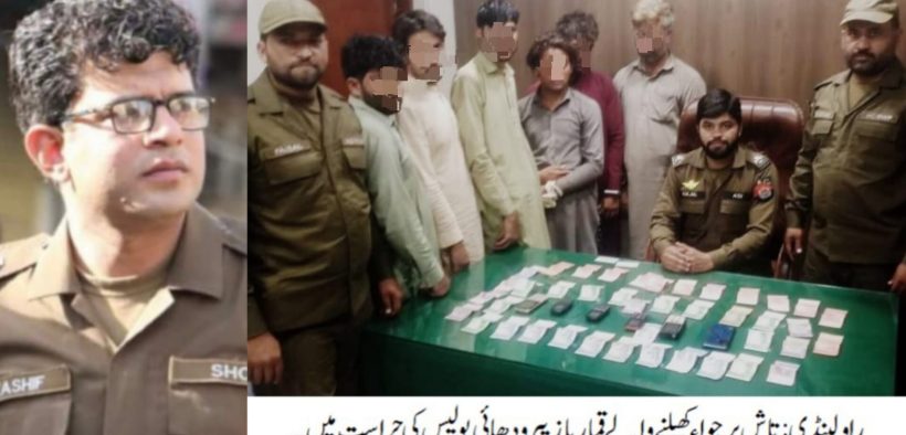راولپنڈی ایس ایچ او تھانہ پیرودھائی ملک کاشف کی ہمراہ پولیس ٹیم قمار بازوں کے خلاف کاروائی ، تاش پر جواء کھیلنے والے 06 قمار باز گرفتار، داؤ پر لگی رقم 16 ہزار 600 روپے، 06 موبائل فون اور تاش کے پتے برآمد۔ تفصیلات کے مطابق پیرودھائی پولیس نے قمار بازوں کے خلاف کاروائی کرتے ہوئے تاش پر جواء کھیلنے والے 06 قمار بازوں کو گرفتارکر لیا،گرفتار ملزمان میں اختر، اسلام، بادشاہ، یاسین،شیر محمد اور ذیشان شامل ہیں، ملزمان سے داؤ پر لگی رقم 16 ہزار 600 روپے، 06 موبائل فون اور تاش کے پتے برآمدہوئے،ایس پی راول محمد حسیب راجہ نے ایس ایچ او پیرودھائی اور ٹیم کو شاباش دیتے ہوئے کہا کہ قمار بازی دیگر معاشرتی برائیوں کی جڑ ہے، قمار بازوں کے خلاف کاروائیاں جاری رکھی جائیں گی۔