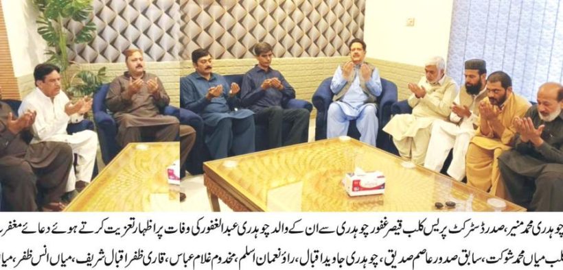 رحیم یارخان محسن رحیم یارخان چوہدری محمدمنیرکی صدرڈسٹرکٹ پریس کلب قیصر غفورچوہدری کی رہائش گاہ آمد، ان کے والدچوہدری عبدالغفورکی وفات پراظہار تعزیت کرتے ہوئے مرحوم کی بخشش کے لیے دعائے مغفرت کی، اس موقع پرمعروف صنعتکارحاجی محمد ابراہیم، جنرل سیکرٹری ڈسٹرکٹ پریس کلب میاں محمدشوکت، سابق صدورعاصم صدیق، چوہدری جاویداقبال، راؤنعمان اسلم، مخدوم غلام عباس سمیت ممبران ڈسٹرکٹ پریس کلب، قاری ظفراقبال شریف، میاں انس ظفر، چوہدری شفیق الرحمٰن، پروفیسرانوارلحق، چوہدری طاہرمحمود، چوہدری بلال جمشید، اورمرحوم کے عزیزواقارب موجودتھے۔ چوہدری محمدمنیرنے تعزیتی گفتگو کرتے ہوئے کہا کہ دنیا میں ہر جاندارکوموت کاذائقہ چکھناہے اوریہ حقیقت ہرایک کے لیے طے شدہ ہے انسان کی کامیابی کا اصل رازنیک اعمال میں پنہاں ہے جودنیاوآخرت دونوں میں اس کے کام آتے ہیں انہوں نے مرحوم چوہدری عبد الغفورکی شخصیت پرروشنی ڈالی اوران کی سیاسی اورسماجی خدمات کوسراہتے ہوئے کہا کہ چوہدری عبد الغفورمرحوم نے اپنے علاقے کی ترقی کے لیے اہم کردار ادا کیا چوہدری عبد الغفور اپنی زندگی میں نہ صرف ایک کامیاب انسان تھے بلکہ انہوں نے اپنی خدمات کے ذریعے علاقے کے عوام کی فلاح و بہبود میں بھی نمایاں حصہ لیاانہوں نے قیصر غفور چوہدری سمیت مرحوم کے تمام لواحقین کو صبر و جمیل کی تلقین کرتے ہوئے کہا کہ اللہ تعالیٰ کی رضا پر راضی رہنا ایک مومن کی سب سے بڑی پہچان ہے، حاجی محمد ابراہیم نے گفتگو کرتے ہوئے کہا کہ چوہدری عبد الغفور کی وفات علاقے کے لیے ایک عظیم نقصان ہے اور ان کی کمی کبھی پوری نہیں ہو سکے گی چوہدری عبد الغفورمرحوم کی شخصیت اس بات کا عملی نمونہ ہے کہ انسان کو دوسروں کی بھلائی کے لیے کام کرتے رہنا چاہیے ان کی وفات سے علاقے میں جو خلاء پیدا ہوا ہے اس کا بھرنا مشکل ہے لیکن ان کے اہل خانہ، دوست احباب اور علاقے کے لوگوں کے دلوں میں ان کی یادیں اور محبت ہمیشہ قائم رہیں گی انہوں نے مرحوم کے اہل خانہ کے لیے دعا کی کہ اللہ تعالیٰ انہیں صبر و ہمت عطا فرمائے اور انہیں اپنے والد کی خدمات کو جاری رکھنے کا حوصلہ دے۔