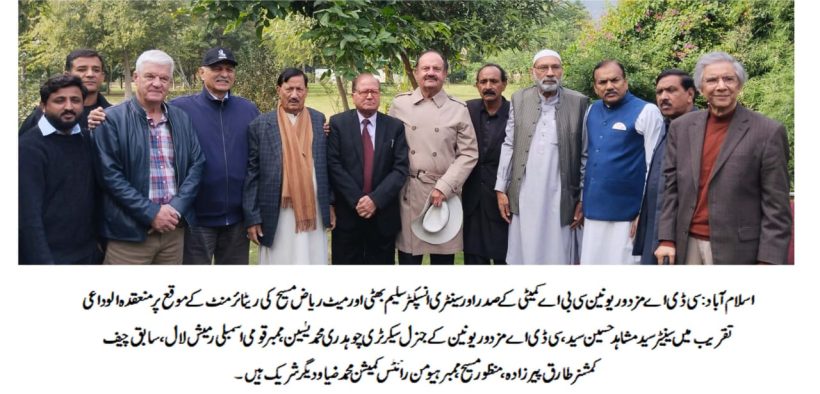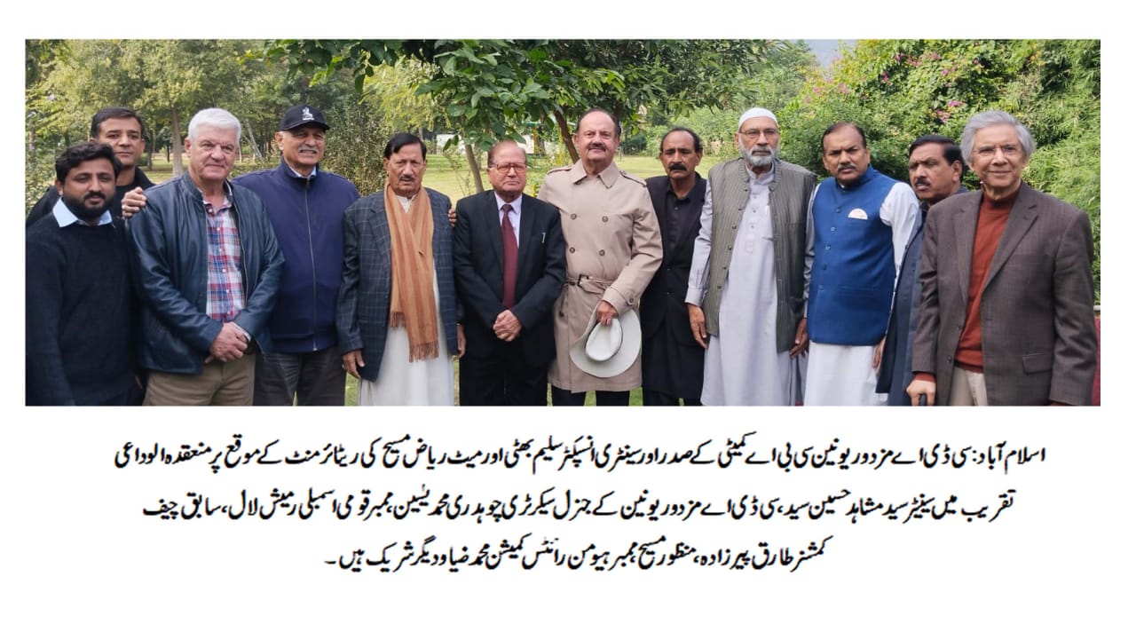 اسلام آباد (ڈیجیٹل پوسٹ) سی ڈی اے مزدور یونین سی بی اے کمیٹی کے صدر اور سینٹری انسپکٹر سلیم بھٹی اور میٹ ریاض مسیح کی ریٹائرمنٹ کے حوالے سے الوداعی تقریب سینیٹر سید مشاہد حسین سید کی طرف سے منعقد کی گئی