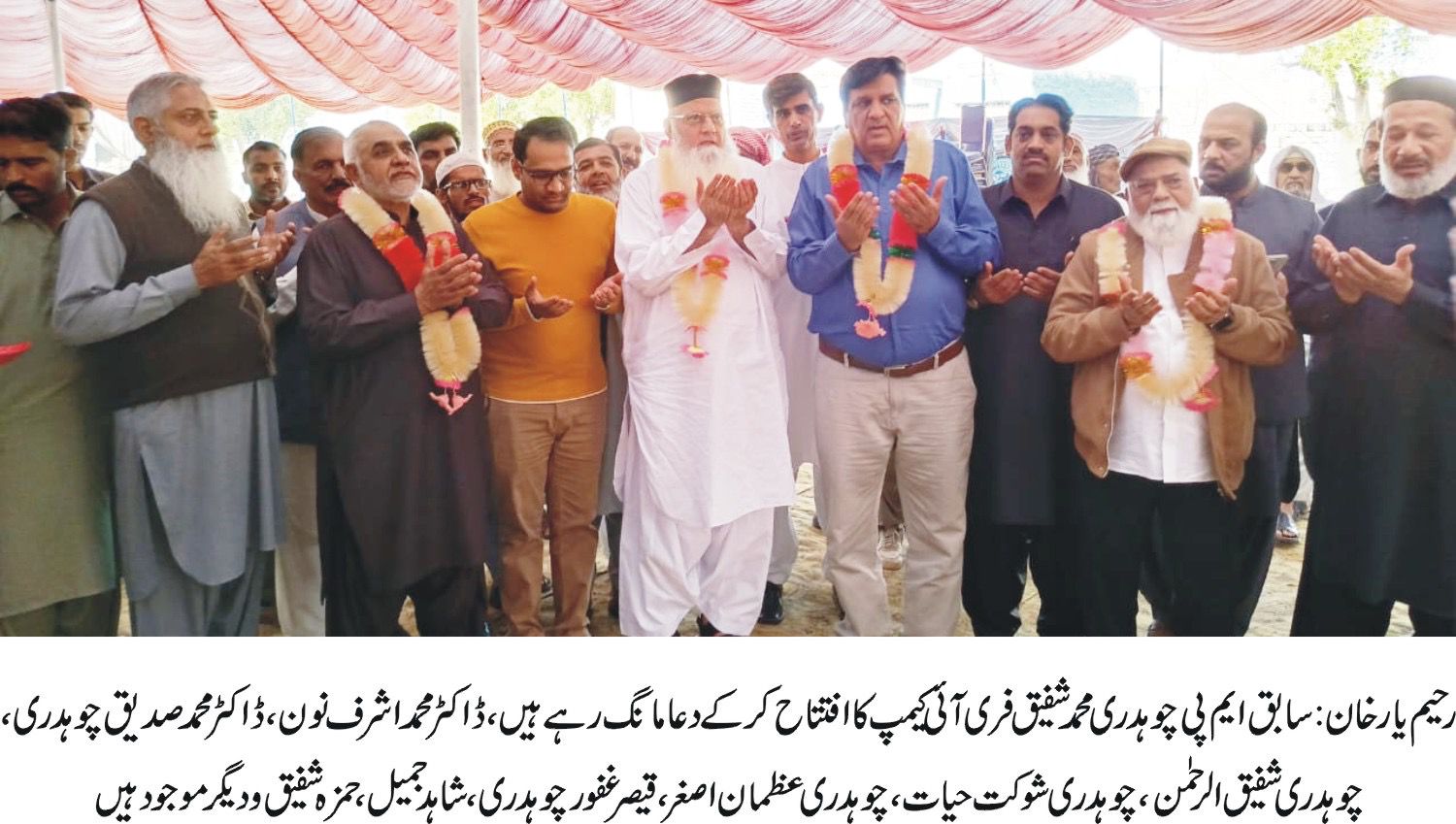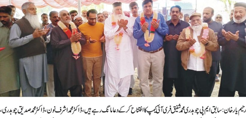 کیپشن:رحیم یارخان: سابق ایم پی چوہدری محمدشفیق فری آئی کیمپ کا افتتاح کرکے دعامانگ رہے ہیں، ڈاکٹر محمداشرف نون، ڈاکٹر محمدصدیق چوہدری، چوہدری شفیق الرحمٰن،چوہدری شوکت حیات، چوہدری عظمان اصغر،قیصر غفور چوہدری، شاہد جمیل،حمزہ شفیق ودیگر موجود ہیں