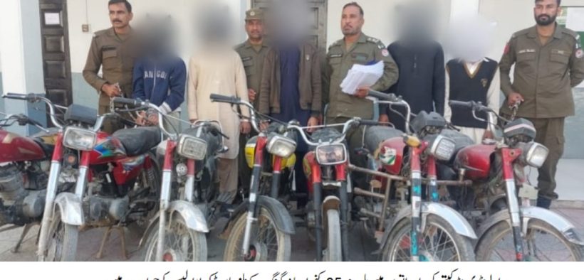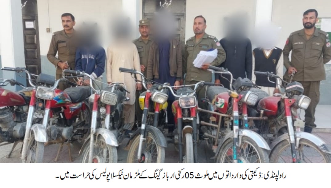 راولپنڈی ایس ایچ او تھانہ ٹیکسلا رانا کاشف کی زیرنگرانی پولیس ٹیم کی کاروائی، ڈکیتی کی وارداتوں میں ملوث 05 رکنی ارباز گینگ گرفتار،ملزمان سے چھینے گئے07 موٹر سائیکل، 02 موبائل فون، رقم 38 ہزار روپے اور اسلحہ برآمد،ملزمان بائکیا بک کرواتے اورگن پوائنٹ پر شہریوں سے موٹرسائیکل و نقدی چھین لیتے تھے۔تفصیلات کے مطابق ٹیکسلا پولیس نے کاروائی کرتے ہوئے ڈکیتی کی وارداتوں میں ملوث 05 رکنی ارباز گینگ کو گرفتار کرلیا،گرفتار ملزمان میں ارباز، اسامہ، سالار، عمر اور فہد شامل ہیں،ملزمان سے چھینے گئے07 موٹر سائیکل، 02 موبائل فون، رقم 38 ہزار روپے اور اسلحہ برآمد،ملزمان بائکیا بک کرواتے اورگن پوائنٹ پر شہریوں سے موٹرسائیکل و نقدی چھین لیتے تھے،ملزمان کو متعدد وارداتوں کے انکشاف پر شناخت پریڈ کے لیے جیل منتقل کیا گیا،ملزمان کی گرفتاری پر ایس پی پوٹھوہار ناصر نواز نے ایس ایچ او ٹیکسلا اور ٹیم کو شاباش دیتے ہوئے کہا کہ شہریوں کو ان کے قیمتی اثاثے سے محروم کرنے والے ملزمان کے خلاف بھر پور کاروائیاں جاری ہیں۔