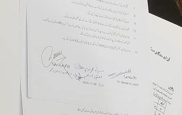 مظفراباد (ڈیجیٹل پوسٹ) آزاد کشمیر میں عوامی مارچ کے بعد حکومت نے صدارتی آرڈیننس واپس لے لیا، مطالبات منظور،دونوں فریقین کے درمیان معاہدہ ہوگیا، 23 جنوری 2025 تک لانگ مارچ کی کال واپس۔