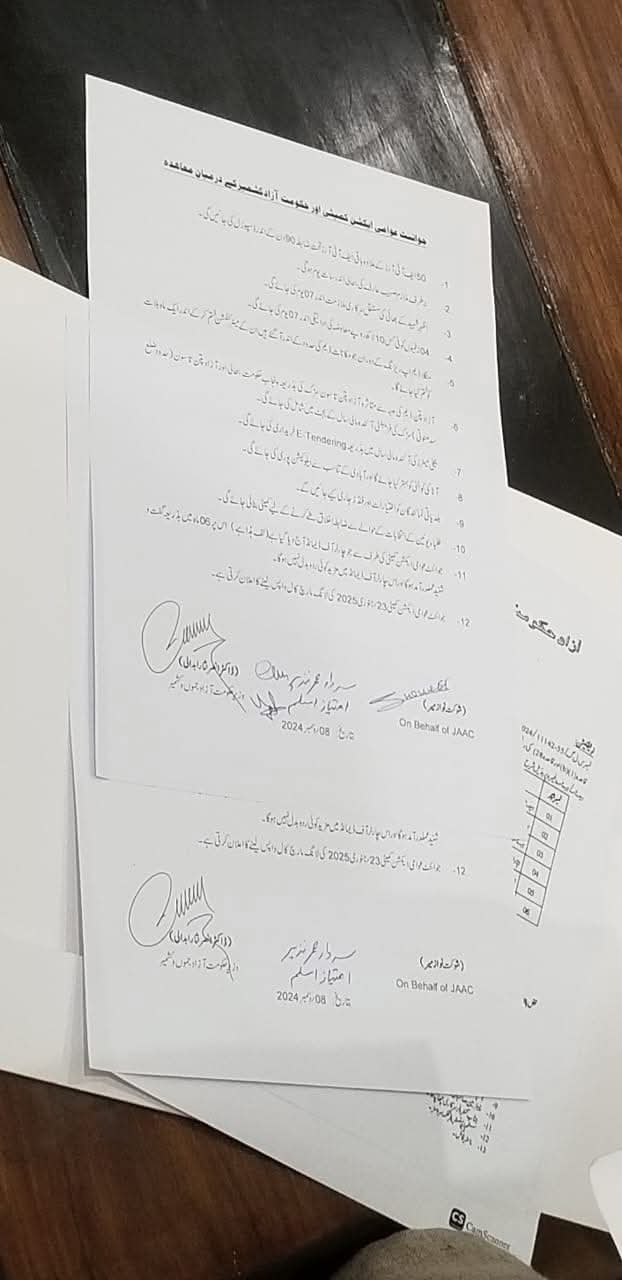 آزاد کشمیر میں عوامی مارچ کے بعد حکومت نے صدارتی آرڈیننس واپس لے لیا، مطالبات منظور،دونوں فریقین کے درمیان معاہدہ ہوگیا، 23 جنوری 2025 تک لانگ مارچ کی کال واپس۔