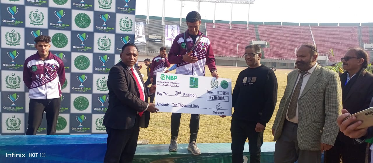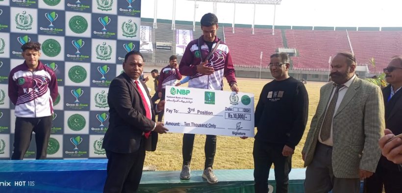 Islamabad (Digital Post) Asghar Ali Mubarak and Shahidul Haq presenting check to winner athlete during the prize distribution ceremony of Quaid-e-Azam Inter-Provincial Games Athletics events.