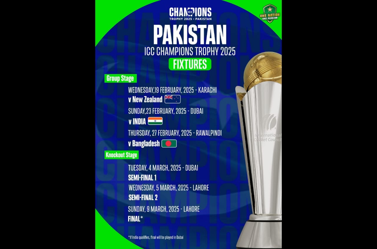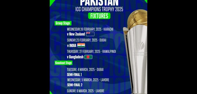 Karachi (Digital Post) The International Cricket Council (ICC) has announced the schedule of the eight-team ICC Champions Trophy 2025, which Pakistan will host from February 19 to March 10. The matches will be played at the three venues of Pakistan – Rawalpindi, Karachi and Lahore, while atleast four matches will be hosted by Dubai International Cricket Stadium in Dubai.