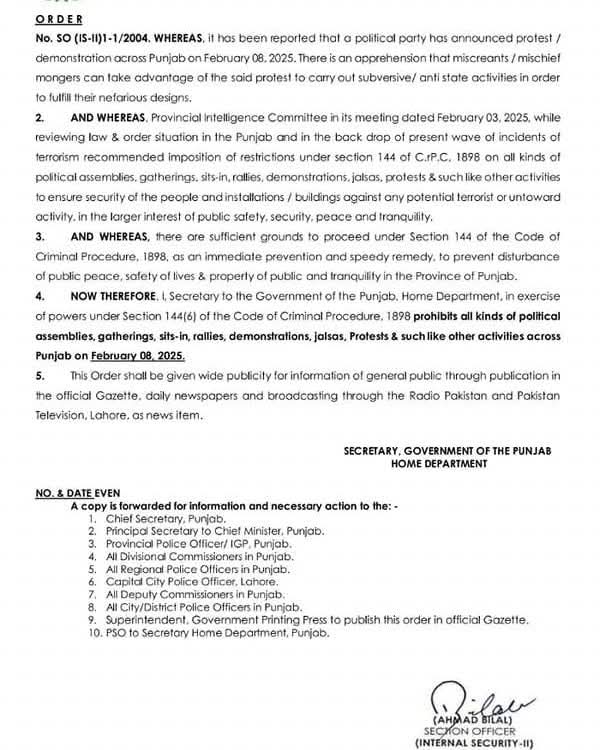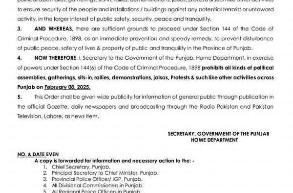 راولپنڈی (ڈیجیٹل پوسٹ) حکومت پنجاب نے صوبہ بھر میں دفعہ 144 نافذ کر دی! پنجاب میں ہفتہ 8 فروری کو ہر قسم کے سیاسی احتجاج، جلسے، جلوس، ریلیوں، دھرنوں اور ایسی تمام سرگرمیوں پر پابندی عائد۔ دفعہ 144 کے نفاذ کا فیصلہ امن و امان کے قیام، انسانی جانوں اور املاک کے تحفظ کیلئے کیا گیا۔ سکیورٹی خطرات کے پیش نظر عوامی جلوس و دھرنا دہشت گردوں کیلئے سافٹ ٹارگٹ ہو سکتا ہے اور شرپسند عناصر عوامی احتجاج کا فائدہ اٹھا کر اپنے مذموم عزائم کی تکمیل کیلئے ریاست مخالف سرگرمیاں کر سکتے ہیں۔ دفعہ 144 کے نفاذ کا فیصلہ کابینہ کمیٹی برائے امن و امان اور صوبائی انٹیلیجنس کمیٹی کی سفارش پر کیا گیا۔ محکمہ داخلہ پنجاب نے دفعہ 144 کے نفاذ کا نوٹیفکیشن جاری کر دیا