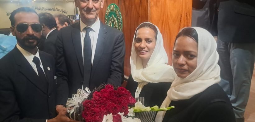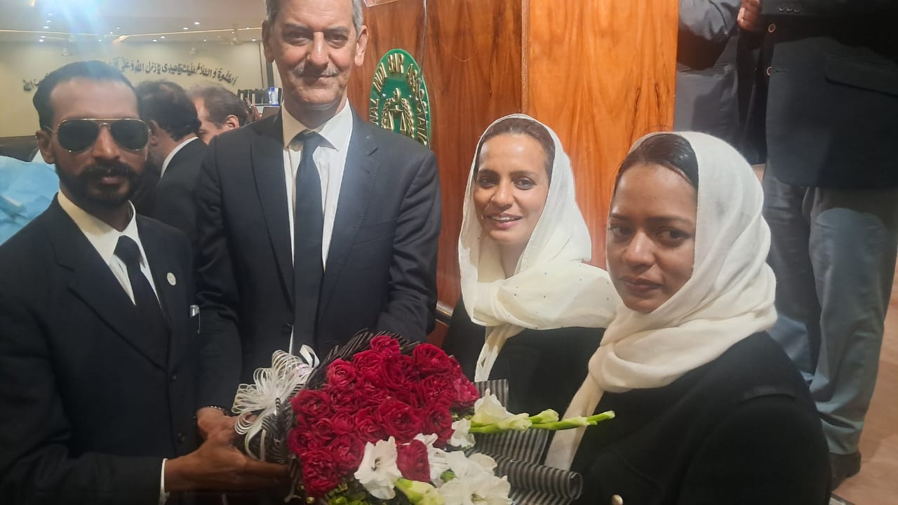 Rawalpindi (Digital Post) The newly elected President of the High Court Bar Association Rawalpindi, Ahsan Hameedullah, presents a bouquet of flowers to Ms. Tahira Bano Mubarak, Member Executive from Rawalpindi Division, during the ceremony. Lawyers Ms. Uzma Mubarak and Azmat Ali Mubarak are also present.