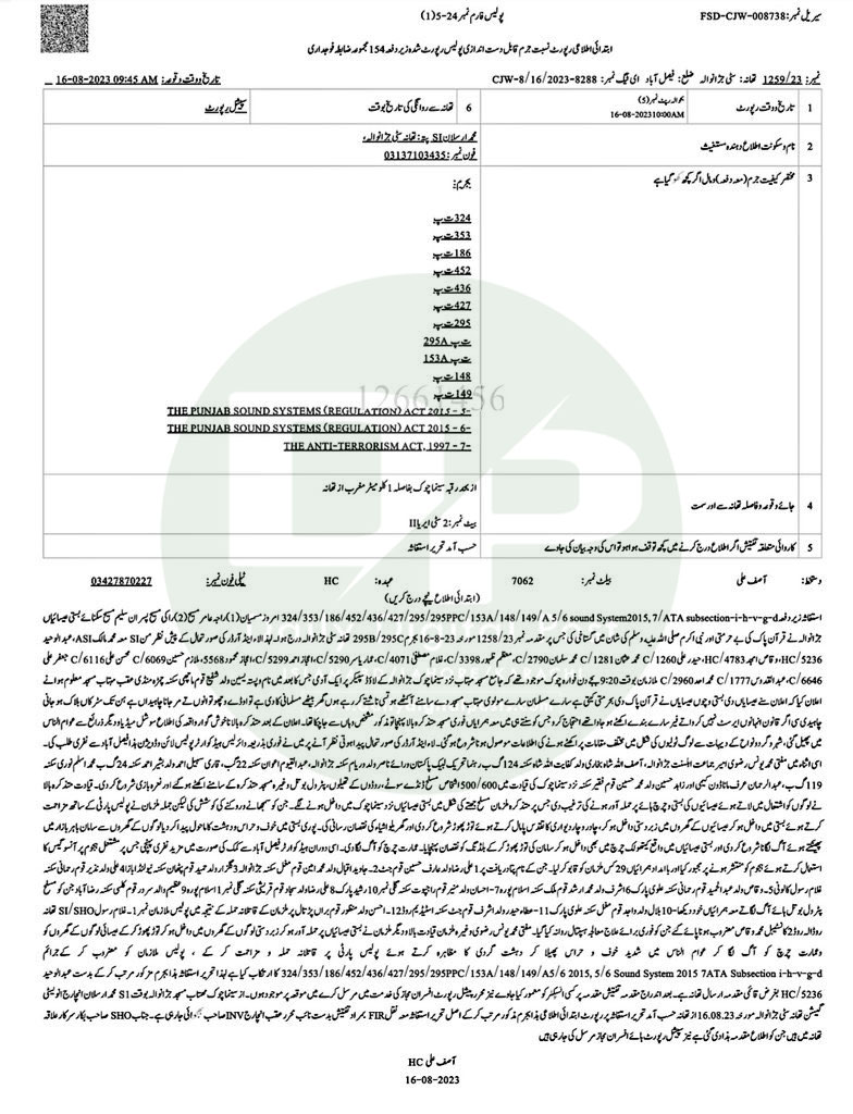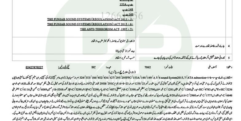 It also invoked sections 148, 149, 153A, 186, 295, 295A, 324, 353, 427, 436 and 452 of the Pakistan Penal Code (PPC). The FIR also included sections 5 and 6 of the Punjab Sound Systems (Regulation) Act 2015.