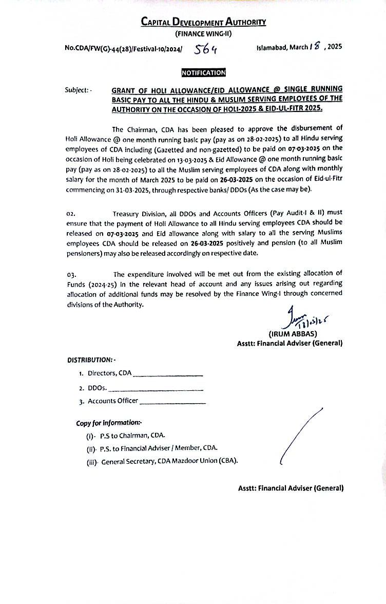 اسلام آباد (ڈیجیٹل پوسٹ) سی ڈی اے مزدور یونین (سی بی اے) کے ساتھ طے شدہ معاہدے کے تحت سی ڈی اے انتظامیہ نے ادارے میں کام کرنے والے تمام مسلم ملازمین کے لیے عیدالاؤنس کی منظوری دے دی جسکا باقاعدہ نوٹیفیکیشن جاری کردیا