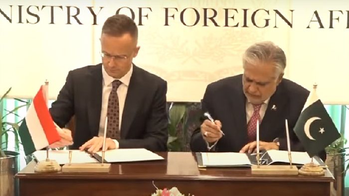 پاکستان اور ہنگری کے درمیان مفاہمتی یادداستوں پر دستخط کرنے کی تقریب اسلام آباد میں منعقد ہوئی، جہاں نائب وزیراعظم و وزیر خارجہ اسحاق ڈار اور ہنگری کے وزیر خارجہ نے مفاہمتی یادداشتوں پر دستخط کئے۔