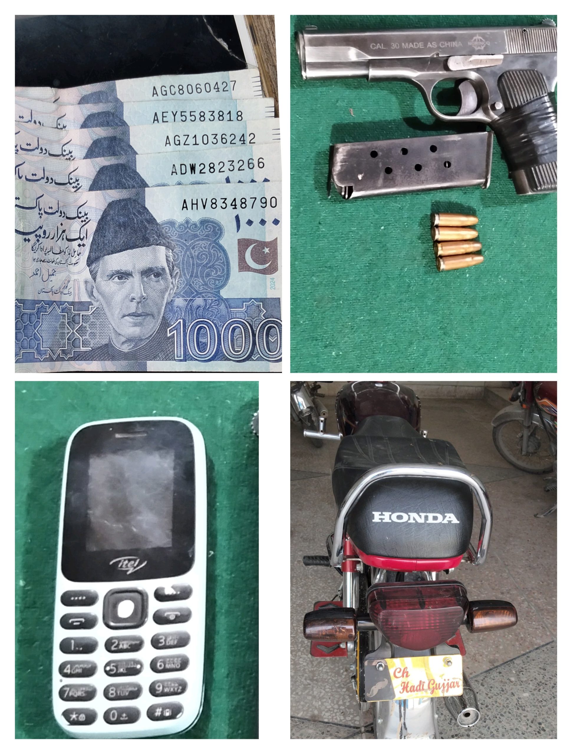 ملزمان سے اسلحہ، لوٹی گئی نقدی، موبائل فونز اور ایک موٹر سائیکل برآمد کی گئی۔ گرفتار شدہ دونوں ملزمان اور برآمد شدہ سامان کو ڈی ایس پی بیٹ 10 سید اسد عباس اور ایڈمن آفیسر انسپکٹر الطاف حسین کی موجودگی میں مزید تفتیش کے لیے مقامی پولیس کے حوالے کردیا گیا۔