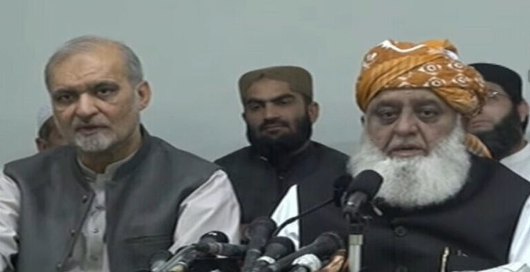 لاہور میں جمعیت علمائے اسلام کے سربراہ مولانا فضل الرحمان نے امیر جماعت اسلامی حافظ نعیم الرحمان کے ہمراہ نیوز کانفرنس کرتے ہوئے کہا کہ فلسطین کی صورتحال پوری امت کیلئے باعث کرب ہے، 27 اپریل کو مینارپاکستان پر بہت بڑا جلسہ اور مظاہرہ ہوگا۔مولانا فضل الرحمان نے کہا کہ مذہبی جماعتیں مینار پاکستان جلسے میں شریک ہوں گی، فلسطین کی صورتحال پوری امت کیلئے باعث تشویش ہے، فلسطین کیلئے ملک بھر میں بیداری مہم چلائیں گے، حافظ نعیم نے انتہائی محبت اور احترام کا مظاہرہ کیا، مجلس اتحادامت کے نام سے ایک پلیٹ فارم تشکیل دیا جا رہا ہے۔