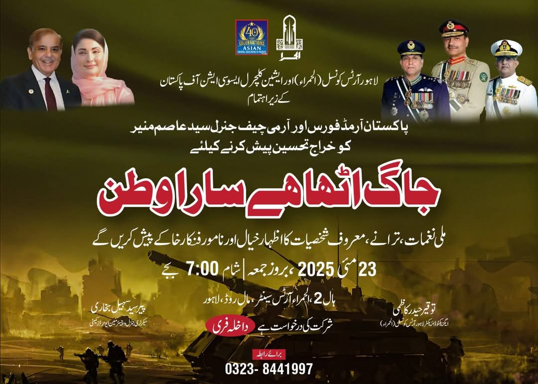 لاہور (ڈیجیٹل پوسٹ) ایشین کلچرل ایسوسی ایشن آف پاکستان لاہور آرٹس کونسل ( الحمراء) کے اشتراک سے ٹربیوٹ پاکستان آرمڈ فورس اور عزت سادات جنرل عاصم منیر ” جاگ اٹھا ھے سارا وطن ‘ کے عنوان سے آج 23 ، مئی کو الحمراء ہال 2 شاہراہ قائد اعظم لاہور میں منعقد ہو رہی ہے – سپیکر پنجاب اسمبلی ملک احمد خان مہمان خصوصی ہونگے