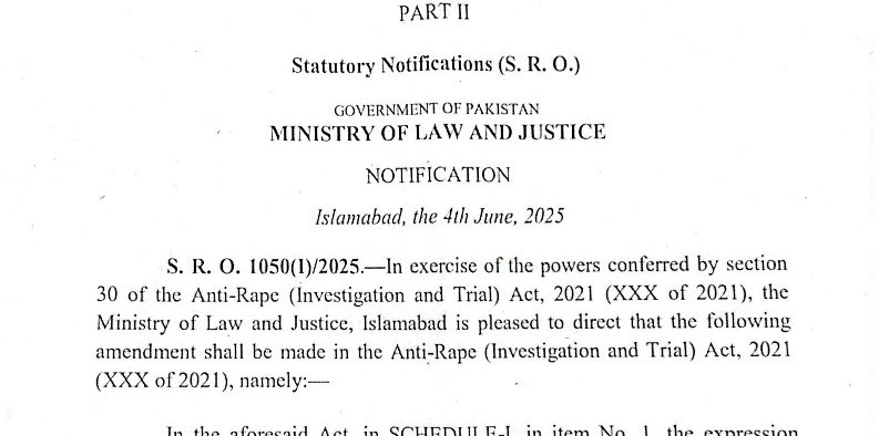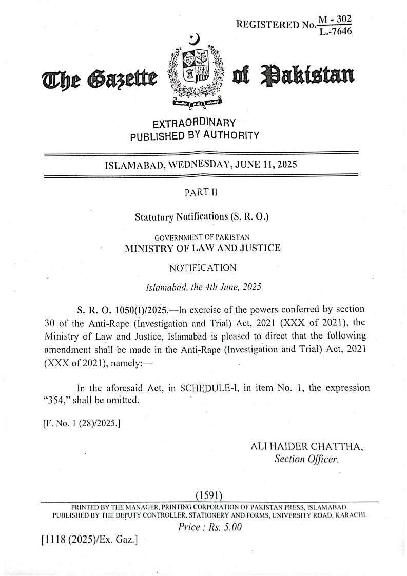 اسلام آ باد، 17 جون 2025 (ڈیجیٹل پوسٹ)۔ وزارت قانون و انصاف نے خصوصی کمیٹی کی سفارش پر انسداد عصمت دری (تحقیقات اور ٹرائل) ایکٹ 2021 سے دفعہ 354 کو ہٹادیا