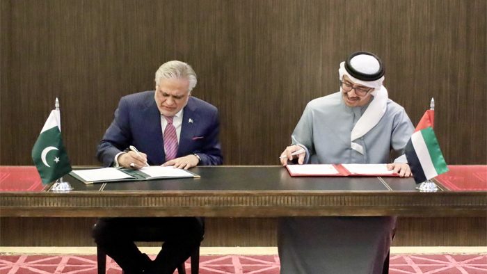 وزیر خارجہ و نائب وزیراعظم اسحاق ڈار اور ان کے ہم منصب شیخ عبداللہ بن زاید کی قیادت میں گزشتہ رات گئے ہونے والے اہم اجلاس کو دونوں برادر ممالک کے درمیان اسٹریٹجک، اقتصادی اور ترقیاتی تعاون کو ایک نئی بلندی تک پہنچانے کی اہم پیشرفت قرار دیا جا رہا ہے۔ اسحاق ڈار نے اپنے ٹوئٹ میں بتایا کہ اجلاس میں تجارت، سرمایہ کاری، توانائی، انفرا اسٹرکچر اور آئی ٹی سمیت مختلف شعبوں میں ہونے والی پیش رفت کا تفصیلی جائزہ لیا گیا۔