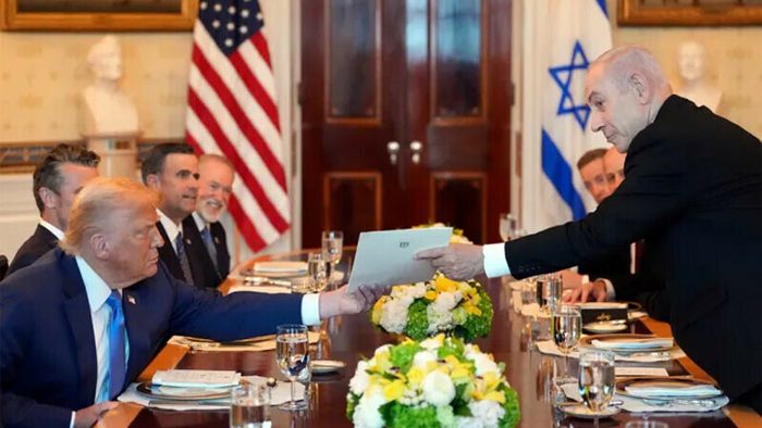 واشنگٹن (ڈیجیٹل پوسٹ)(آئی پی ایس) اسرائیلی وزیراعظم بینجمن نیتن یاہو نے وائٹ ہاؤس میں امریکی صدر ڈونلڈ ٹرمپ سے ملاقات کے دوران کہا کہ وہ فلسطین میں دو ریاستی حل کو مسترد کرتے ہیں، کیونکہ ایک آزاد فلسطینی ریاست “اسرائیل کو تباہ کرنے کا پلیٹ فارم” بن سکتی ہے۔