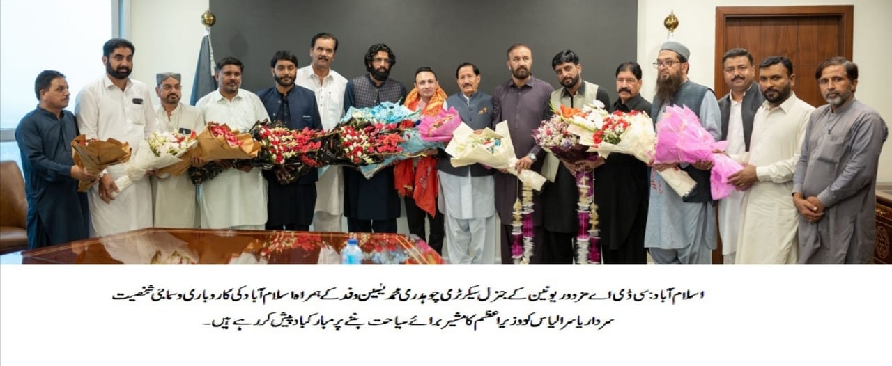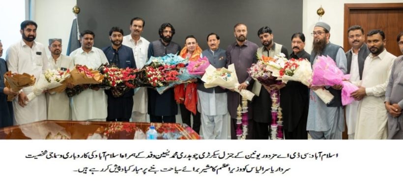 اسلام آباد (ڈیجیٹل پوسٹ) سی ڈی اے مزدور یونین کے جنرل سیکرٹری چوہدری محمد یٰسین، پاکستان ورکرز فیڈریشن کے جنرل سیکرٹری اسد محمود، مزدور یونین کے سپریم ہیڈ مرزا سعید اختر، چیف آرگنائزر ملک محمد عاصم، سینئر رہنما اظہر خان تنولی، اظہار عباسی، ایڈیشنل جنرل سیکرٹری ملک محمد سرفراز، چیف کورآرڈینیٹر چوہدری واجد گجر، سینئر نائب صدر چوہدری ابرار، ڈپٹی جنرل سیکرٹری صفدر عباسی نے سوشل میڈیا ٹیم کے ہمراہ اسلام آباد کی کاروباری و سماجی شخصیت سردار یاسر الیاس کو وزیر اعظم کامشیر برائے سیاحت بننے پر مبارکباد پیش کی۔اس موقع پر قائد مزدور چودھری محمد یٰسین نے سردار یاسر الیاس کی اسلام آباد شہر کے لیے خدمات کو خراج تحسین پیش کرتے ہوئے کہا کہ یہ ہمارے لیے اعزاز کی بات ہے کہ سردار یاسر الیاس کو مشیر برائے سیاحت کا قلمدان دیا گیا ہے اور ہم امید کرتے ہیں کہ سیاحت کے فروغ اور دارالحکومت کو مزید خوبصورت بنانے کے لیے وہ اہم کردار ادا کریں گے اس سلسلے میں سی ڈی اے مزدور یونین ان کے ساتھ مکمل تعاون کا یقین دلاتی ہے۔اس موقع پروزیر اعظم کے مشیر برائے سیاحت سردار یاسر الیاس نے وفد کا شکریہ ادا کرتے ہوئے کہا کہ مزدور اس ملک کی معیشت میں ریڑھ کی ہڈی کی حیثیت رکھتا ہے اس لیے مزدوروں کی خوشحالی کے لیے ہم مل کر چلیں گے۔ اسلام آباد میں باہمی مشاورت سے سیاحت کو فروغ دینے لیے مختلف فیسٹیول اور پروگرام کا انعقاد کیا جائے گا تا کہ ملک میں سیاحت کرو فروغ مل سکے اور پاکستان بین الاقوامی سیاحوں کے لیے توجہ کا مرکز بنے۔