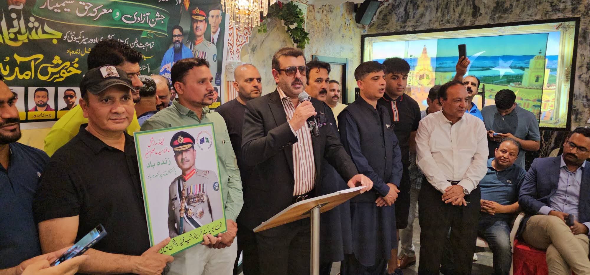 These views were expressed at the Pakistan Independence Day Seminar organized by EU-Pak Friendship Federation yesterday. The ceremony was attended by Chaudhry Pervaiz Iqbal Lohsar, Chairman EU-Pak Friendship Federation, while Pakistan Consulate Barcelona was represented by Welfare Attaché Salik Gondal and Pakistan Peoples Party Spain Secretary of Information Iqbal Gul Waheed Khattak, in addition to a large number of Pakistani community members. President EU-Pak Friendship Kamran Khan performed the duties of the Secretary of State. Shahid Ahmed Shahid recited the Holy Quran. Rizwan Kazmi received the honor of reciting the Holy Quran. Owais Haideri presented a naat-kalam. Saeed Haideri Qadeer Ahmed Khan presented national songs. Long live Pakistan, long live the Pak Army, long live Field Marshal Syed Hafiz Asim Munir read the slogans and national anthem. Grand Independence Day of Pakistan Cake was cut by G.B.A.L.A.L. Sharif, Rizwan Kazmi, Malik Hafeez Awan, Malik Naveed Awan, Malik Shafiq Awan. Raja Mudassar Iqbal Bilani, Abdul Waheed Khattak, Overseas Community Officer, Immigration Consulate Office Barcelona, Muhammad Iqbal Chaudhry, Kamran Khan, Khalid Shahbaz Chauhan, Syed Abdul Qadir Gilani, and Chaudhry Pervez Iqbal Lohsar, Chairman, EU-Pak Friendship Federation also spoke.