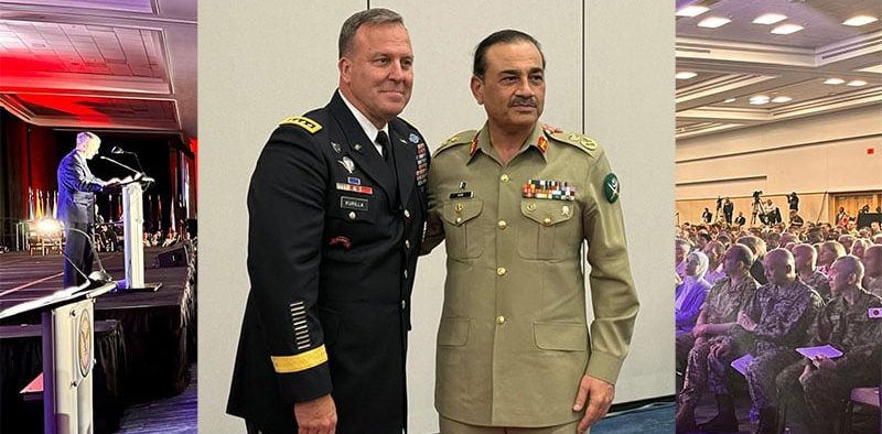 پاکستانی کمیونٹی کے ساتھ ایک مکالمہ کی نشست میں آرمی چیف نے انہیں پاکستان کے روشن مستقبل پر پُراعتماد رہنے اور سرمایہ کاری کے فروغ میں فعال کردار ادا کرنے کی ترغیب دی، پاکستانی نژاد کمیونٹی نے پاکستان کی ترقی و خوشحالی میں بھرپور تعاون کے عزم کا اعادہ کیا۔ آئی ایس پی آر کے جاری کردہ بیان کے مطابق پاکستان کے چیف آف آرمی اسٹاف فیلڈ مارشل سید عاصم منیر نے وائٹ ہاؤس میں امریکا کے صدر ڈونلڈ ٹرمپ سے ملاقات کی تھی، اعلیٰ سطح کی یہ ملاقات کابینہ روم میں ظہرانے کے دوران ہوئی، جس کے بعد اوول آفس کا دورہ بھی کیا تھا۔ یاد رہے کہ 19 جون 2025 کو امریکہ کو واشنگٹن میں آرمی چیف فیلڈ مارشل عاصم منیر نے کہا تھا کہ پاکستان خطے میں کشیدگی کم کرنے اور باہمی سکیورٹی فریم ورک کے فروغ میں ایک ذمہ دار اور متحرک کردار ادا کرتا رہے گا ممتاز سکالرز، تجزیہ کاروں، پالیسی ماہرین اور بین الاقوامی میڈیا اداروں کے نمائندوں سے گفتگو میں فیلڈ مارشل عاصم منیر نے علاقائی اور عالمی تنازعات کے حوالے سے پاکستان کے متوازن موقف کی بھی وضاحت کی تھی ، ’جس میں مکالمے، سفارت کاری اور بین الاقوامی قوانین کی پاسداری پر زور دیا گیا تھا تھنک ٹینکس اور سٹریٹیجک امور کے اداروں کے نمائندوں سے ملاقات میں پاکستان کے علاقائی اور عالمی معاملات پر اصولی موقف پیش کرنے اور پاکستان کے سٹریٹیجک وژن کو بہتر انداز میں اجاگر کرنے کا موقع میسر آیا تھا ۔’چیف آف آرمی سٹاف نے علاقائی امن و استحکام کے لیے پاکستان کے غیر متزلزل عزم اور اصولوں پر مبنی عالمی نظام کے فروغ میں تعمیری کردار پر روشنی ڈالی تھی, جبکہ فیلڈ مارشل نے معرکہ حق، آپریشن بنیان مرصوص کی تفصیلات اور تجزیے کا حوالہ دیتے ہوئے ’دہشت گردی‘ سے متعلق پاکستان کے مؤقف کی وضاحت بھی کی تھی۔ فیلڈ مارشل عاصم منیر نے ’اس بات پر زور دیا تھا کہ بعض علاقائی عناصر دہشت گردی کو ہائبرڈ وار فیئر کے ہتھیار کے طور پر استعمال کر کے خطے میں بدامنی پیدا کرنے کی کوشش کر رہے ہیں۔