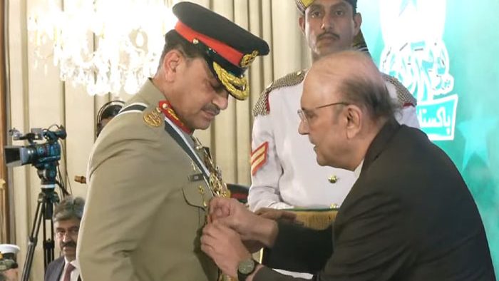 اعلیٰ اعزازات دینے کی تقریب میں صدر مملکت آصف علی زرداری نے چیئرمین جوائنٹ چیفس آف سٹاف کمیٹی جنرل ساحر شمشاد مرزا کو نشان امتیاز عطاء کیا جبکہ فیلڈ مارشل سید عاصم منیر کو معرکہ حق کے دوران انتہائی مشکل وقت میں جنگ کی قیادت کی لازوال جرات، جنگی مہارت اور غیر متزلزل حب الوطنی کے اعتراف میں ہلال جرأت سے نوازا گیا۔