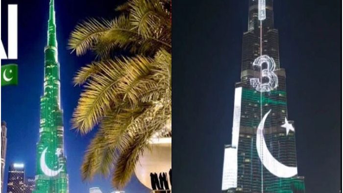 اس موقع پرپاکستانیوں کی ایک بڑی تعداد پاکستانی پرچم میں لپٹے برج خلیفہ دیکھنے پہنچی، قومی ترانے کی دھن کے ساتھ دنیا کی بلند ترین عمارت پر پاکستانی پرچم کا عکس لہراتا رہا۔