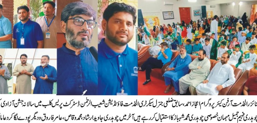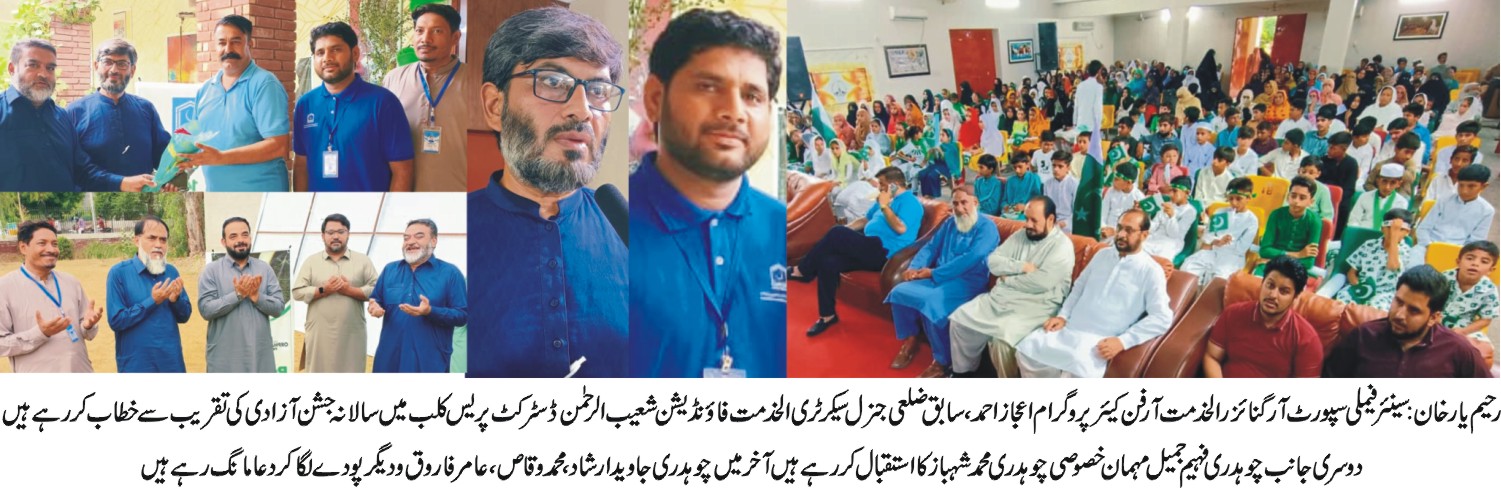 رحیم یارخان (ڈیجیٹل پوسٹ) الخدمت فاؤنڈیشن ضلع رحیم یارخان کے زیراہتمام آرفن کیئر پروگرام کی سالانہ جشنِ آزادی کی تقریب ڈسٹرکٹ پریس کلب رحیم یارخان کے آڈیٹوریم میں منعقد ہوئی
