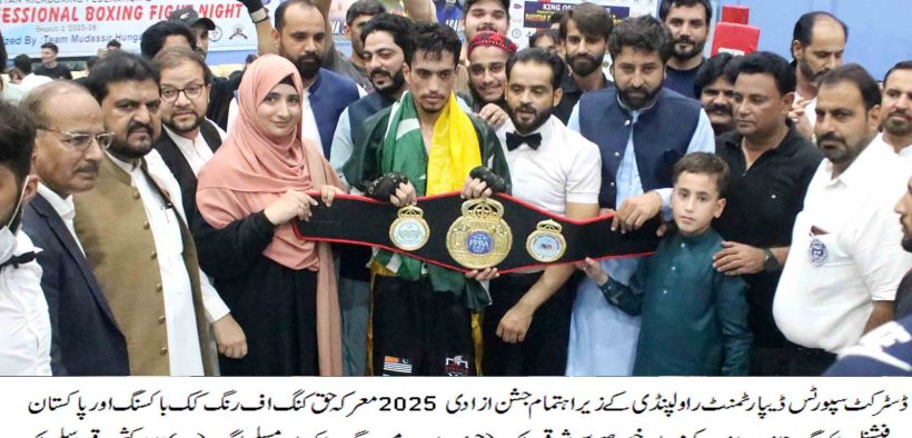 راولپنڈی (ڈیجیٹل پوسٹ) معرکہ حق کنگ آف رنگ پروفیشنل باکسنگ فائٹ کا ٹائٹل پاکستان کے نام;اسامہ ساجد ملک , بشری’ اختر کی جیت
