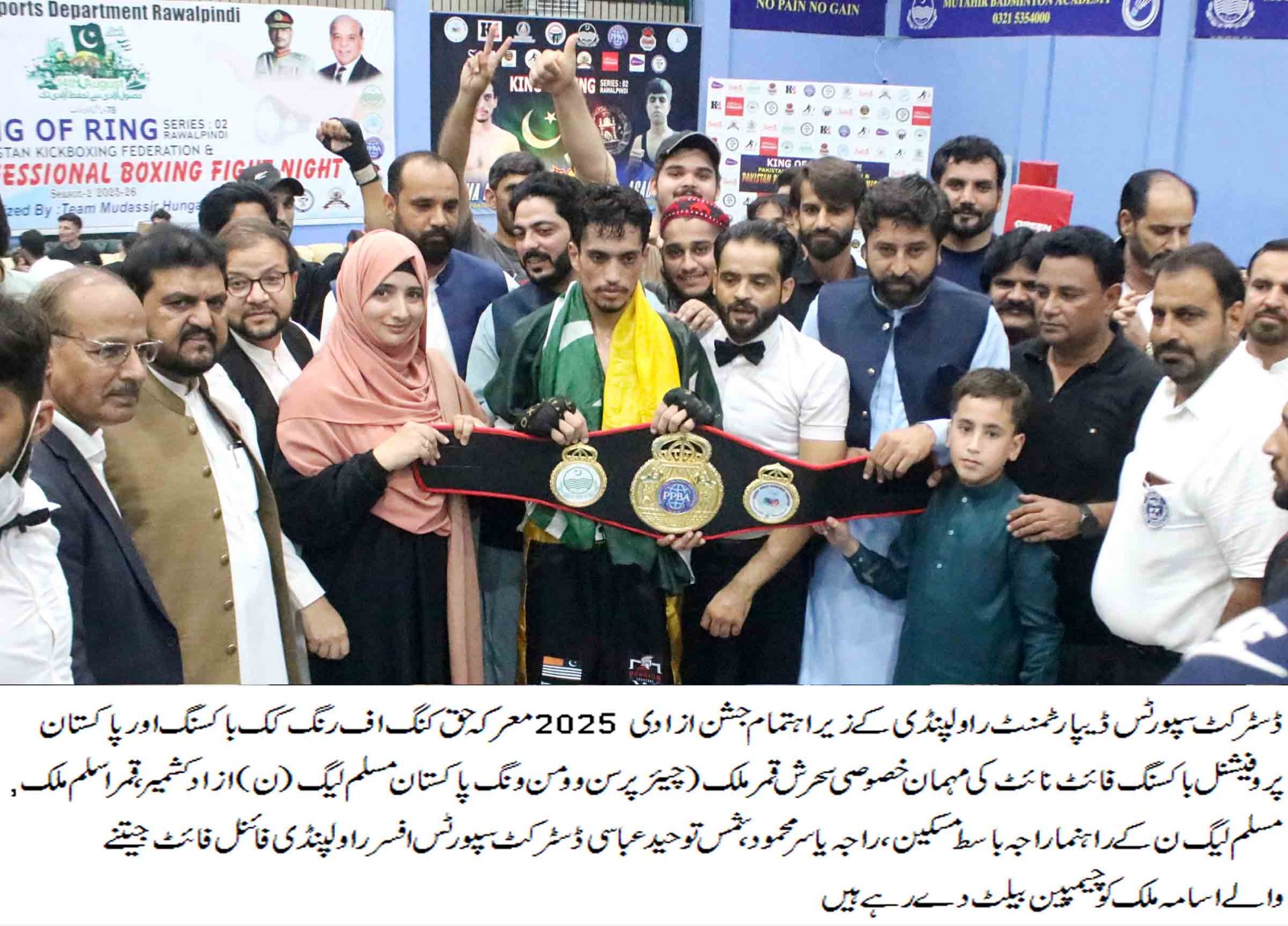 راولپنڈی (ڈیجیٹل پوسٹ) کنگ آف رنگ پروفیشنل باکسنگ فائٹ کے ٹائٹل پاکستان کے اسامہ ساجد ملک اور بشری’ اختر کے نام، دونوں پاکستانی فائٹرز نے افغان حریفوں کو شکست دی۔کنگ آف رنگ کک باکسنگ فائٹ بشری اختر پاکستان اور منیرہ بختیاری افغانستان کے مابین ہوئی جس میں بشری اختر نے دوسرے ہی راؤنڈ میں افغانستان کی کھلاڑی کو ناک اؤٹ کر کے بیلٹ ٹائٹل پاکستان کے نام کیا۔جبکہ پروفیشنل باکسنگ فائٹ اسامہ ساجد ملک پاکستان بمقابلہ اسد ﷲ افغانستان کے مابین ہوئی جو کہ اسامہ ساجد ملک نے تیسرے ہی راؤنڈ میں اپنے حریف کو ناک آؤٹ کر کے بیلٹ ٹائٹل پاکستان کے نام کیا۔تفصیلات کے مطابق ڈسٹرکٹ سپورٹس ڈیپارٹمنٹ راولپنڈی کے زیر اہتمام جشن ازادی 2025 معرکہ حق کنگ اف رنگ کک باکسنگ اور پاکستان پروفیشنل باکسنگ فائٹ نائٹ ایونٹ شہباز شریف سپورٹس کمپلیکس میں منعقد ہوا،اختتامی تقریب کی مہمان خصوصی محترمہ سحرش قمر ملک چیئر پرسن ویمن ونگ پاکستان مسلم لیگ (ن) ازاد کشمیر تھی ان کے ہمراہ قمر اسلم ملک,مسلم لیگ ن کے راہنما راجہ باسط مسکین،راجہ یاسر محمود پی ایس ٹو،برسٹر دانیال چوہدری ایم این اے سردار طاہر،سردار نعیم،ملک رئیس اعوان،ملک نوید صادق،ملک عاصم بہاولپور ایکسپریس صدر صدام عباسی تھے۔مہمان خصوصی سحرش قمر ملک نے کھلاڑیوں میں میڈلز اور آفیشلز میں شیلڈز تقسیم کیں ڈسٹرکٹ سپورٹس ڈیپارٹمنٹ راولپنڈی کی شاندار ایونٹ کرانے پر مبارکباد دی، اس موقع پر چیئرمین آرگنائزنگ کمیٹی شمس توحید عباسی ڈسٹرکٹ سپورٹس افسر راولپنڈی ،آرگنائزنگ سیکرٹری مدثر بشیر ملک محمد ساجد اعوان کا بھی خوبصورت ایونٹ کرانے پر مبارکباد پیش کی